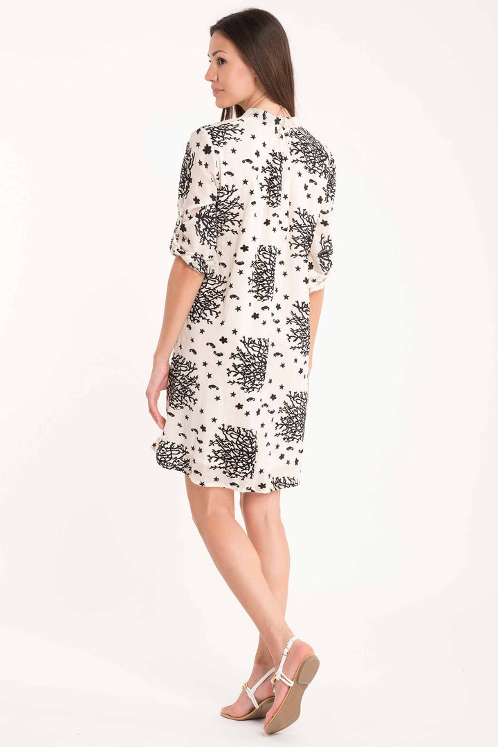 Das Korallen-Hemdkleid aus reinem Baumwollstoff verbindet die strukturelle Einfachheit eines Hemdes mit der Eleganz eines kompletten Kleides, perfekt für diejenigen, die Komfort ohne stilistische Kompromisse suchen. Der Baumwollstoff garantiert Atmungsaktivität und Weichheit auf der Haut, ideal für die warme Jahreszeit. Das Korallenmuster verleiht dem Design Charakter und Bewegung, wodurch es sowohl für legere als auch für halbformelle Anlässe geeignet ist.