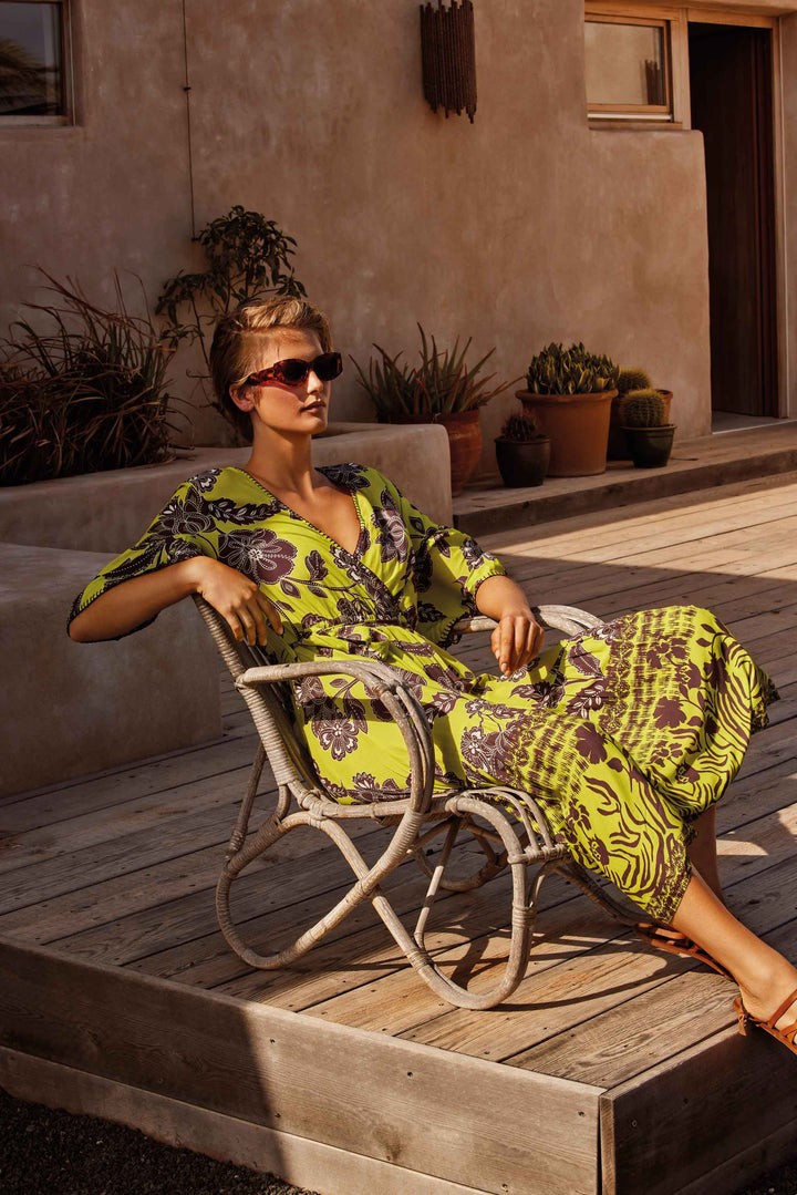 Dieses lange Blumenkleid in Limettenfarbe ist die perfekte Mischung aus Eleganz und Weiblichkeit. Das lange Modell schmälert die Figur, während die Rüschenärmel einen romantischen Touch verleihen. Der überkreuzte V-Ausschnitt betont das Dekolleté und der Wickelverschluss garantiert eine perfekte Passform. Mit dem mitgelieferten Gürtel können Sie die vita betonen, während der balze für zarte Bewegung sorgt. Das fantasia mit braunen Blumen verleiht einen Hauch von Farbe und Lebendigkeit.