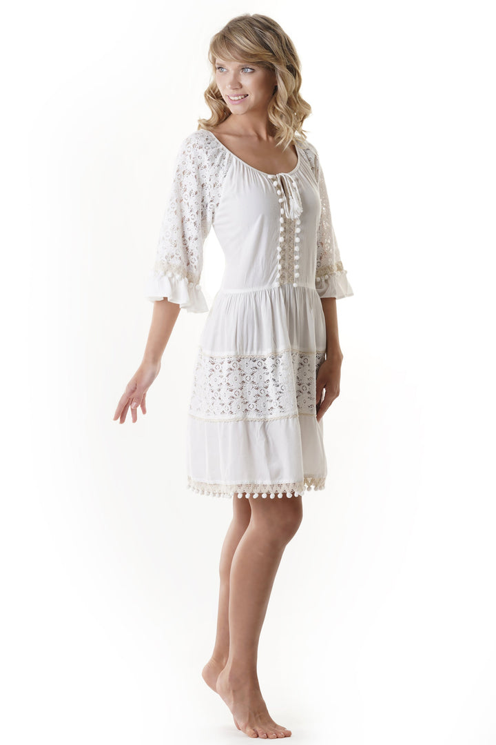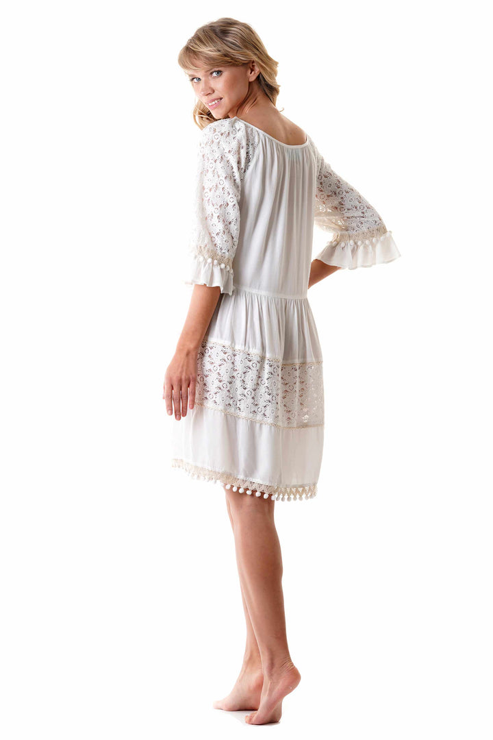 Αυτό το κομψό φόρεμα διαθέτει στρογγυλή λαιμόκοψη με διακοσμητικό κορδόνι στολισμένο με φουντίτσες, που προσθέτει μια εκλεπτυσμένη πινελιά στο σχέδιο. Κατασκευασμένο από 100% βαμβάκι, το ύφασμα εξασφαλίζει διαπνοή και άνεση, ιδανικό για ζεστό κλίμα. Λεπτομέρειες από δαντέλα αναδεικνύουν την κομψή του εμφάνιση, καθιστώντας το μια τέλεια επιλογή για όσους αναζητούν έναν συνδυασμό στυλ και κλασικής τεχνικής.