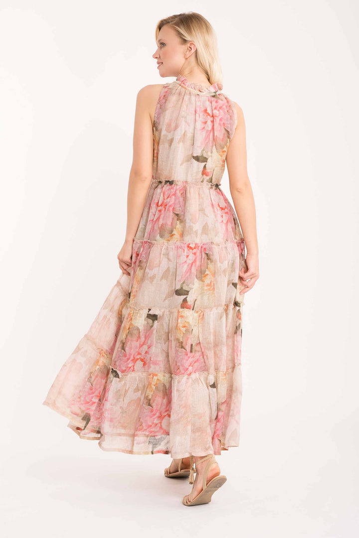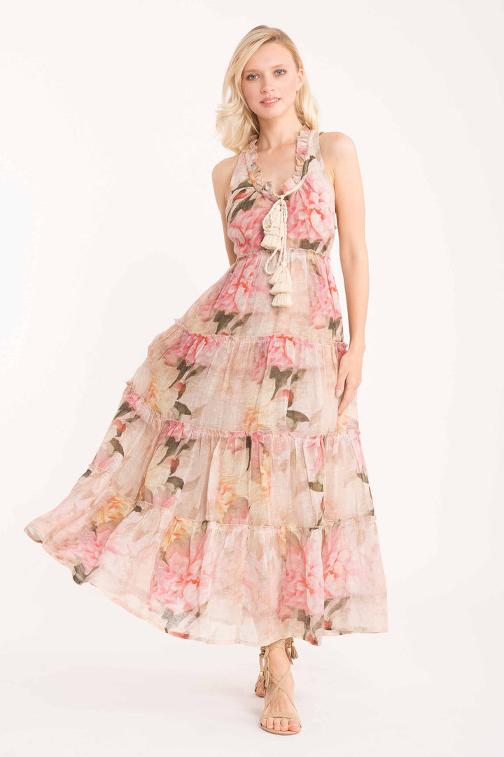 This elegant long dress in pure linen is perfect for summer days at the beach. The skirt characterized by charming ruffles creates movement and lightness, while the floral pattern adds a touch of refinement. The natural fabric ensures breathability and comfort, ideal for those seeking quality and style without compromise. A versatile garment that easily transitions from the beach to casual dinners, always maintaining a sophisticated and fashion-conscious air.