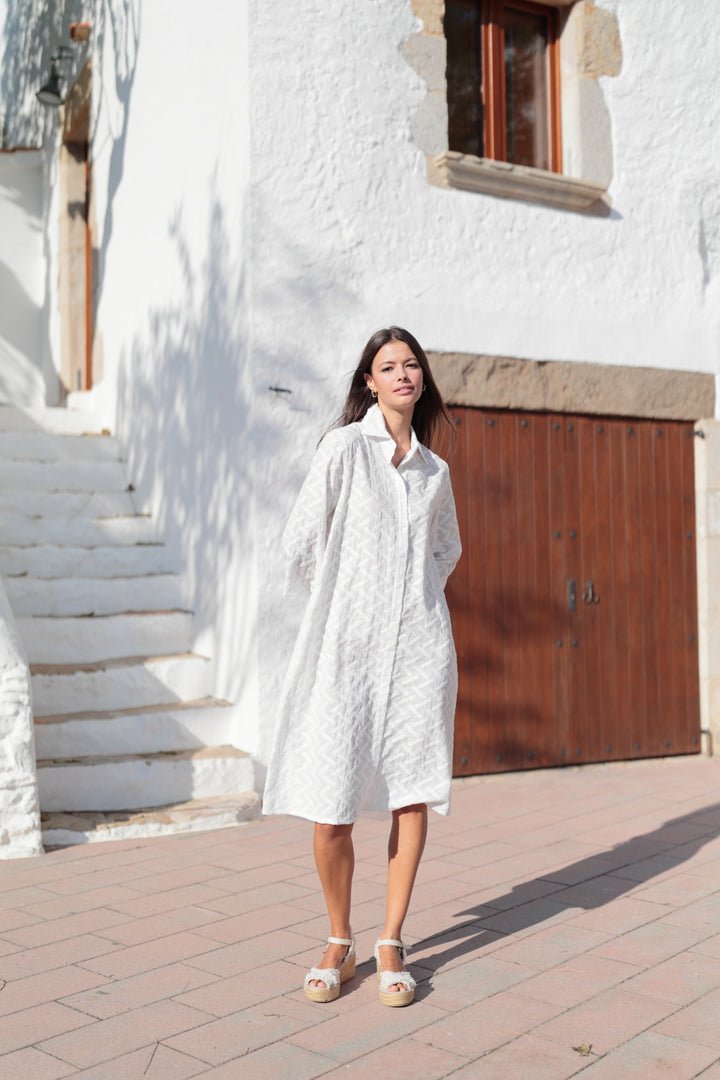 Miami Dress chemisier. In elegant white with coordinated raised embroidery. The cotton fabric offers a delicate and fresh texture for hot days. Fluid cut. The design features a relaxed silhouette with a shirt collar. 3/4 sleeves. The front button opening makes it versatile and easy to wear. This garment is a charming choice to enjoy summer with style and comfort. It is ideal for a casual-chic look that combines lightness and style.