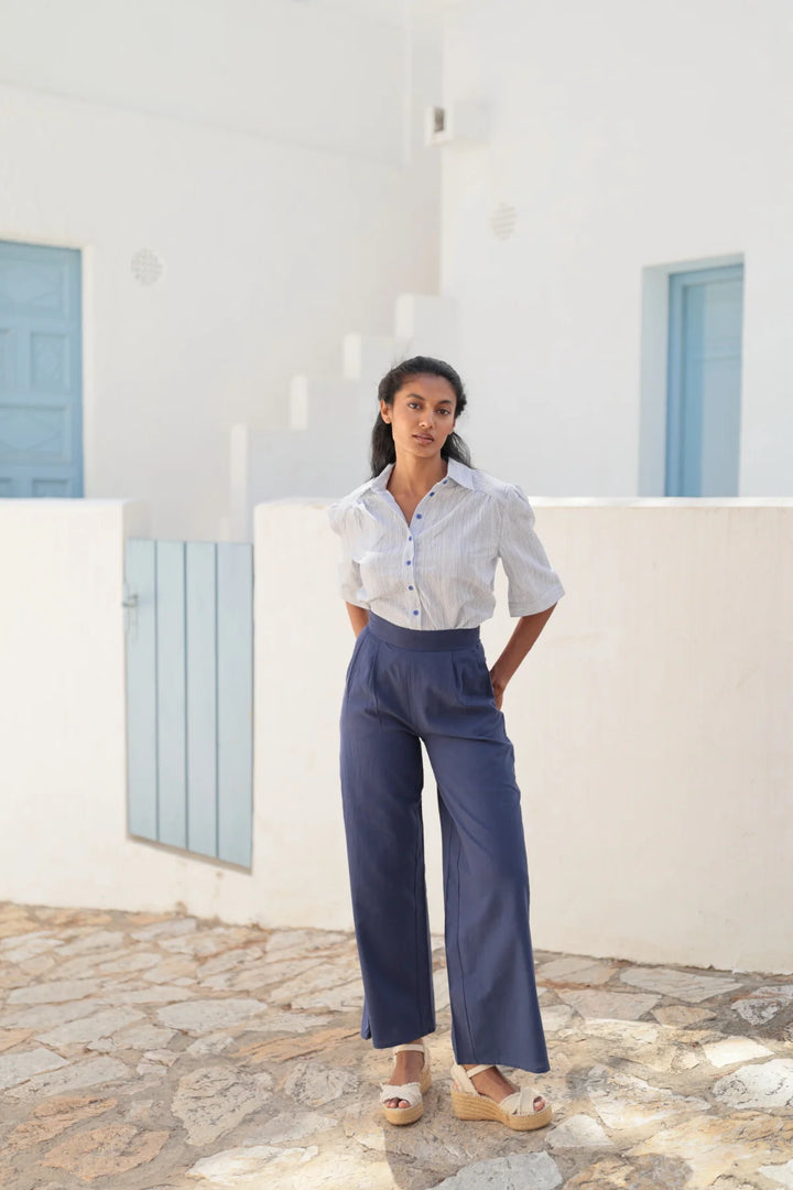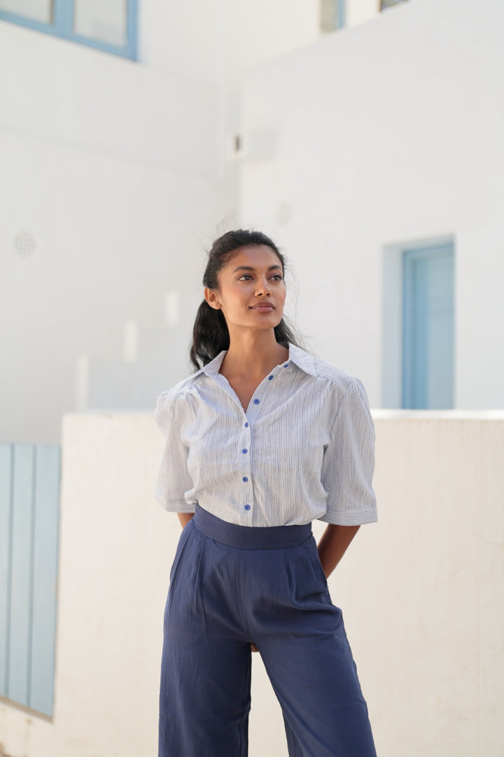 Romantic-inspired striped shirt. The shirt collar and front button opening add a refined touch. Slightly puffed short sleeves and a fitted silhouette.