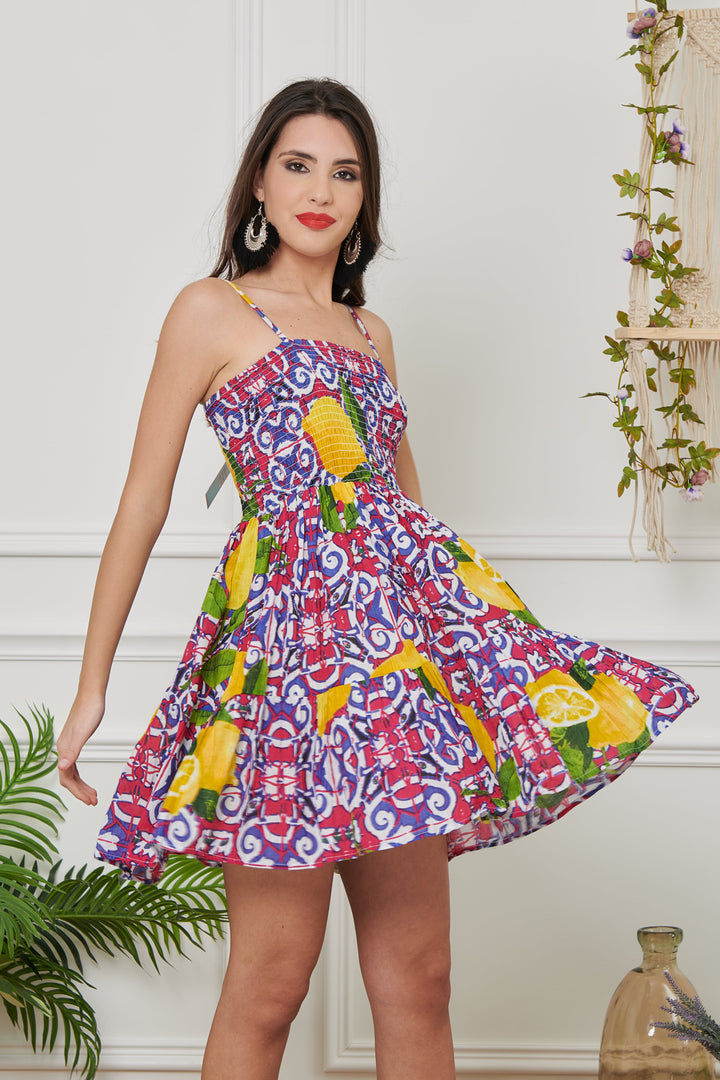 This dress is made from pure cotton fabric to ensure maximum comfort during wear. The elastic bodice fits perfectly to the body, while the pattern and the flared hem make it unique and original. The unplaced print guarantees a unique look for each item.