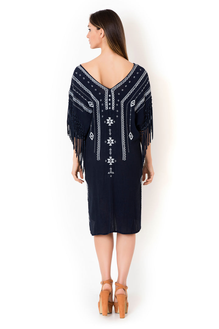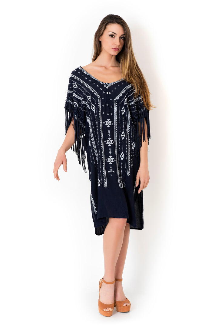 This elegant caftan features a V-neckline that flatters the figure and delicate fringe details on the sleeves, adding subtle movement and texture. Made from breathable cotton fabric, it offers comfort while maintaining a refined look. The side slits facilitate fit and contribute to a harmonious silhouette, making it an ideal choice for summer occasions or stylish casual outings.