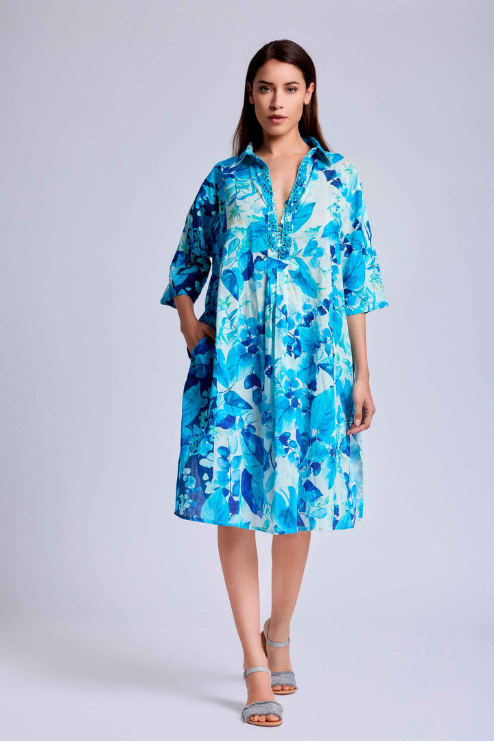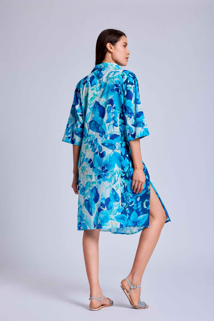 This long shirt dress in pure cotton guarantees freshness and comfort thanks to the natural fabric. The delicate turquoise flowers give a touch of discreet elegance, while the side slits ensure freedom of movement and a contemporary fit. A refined choice for those looking for style and practicality in a single garment.