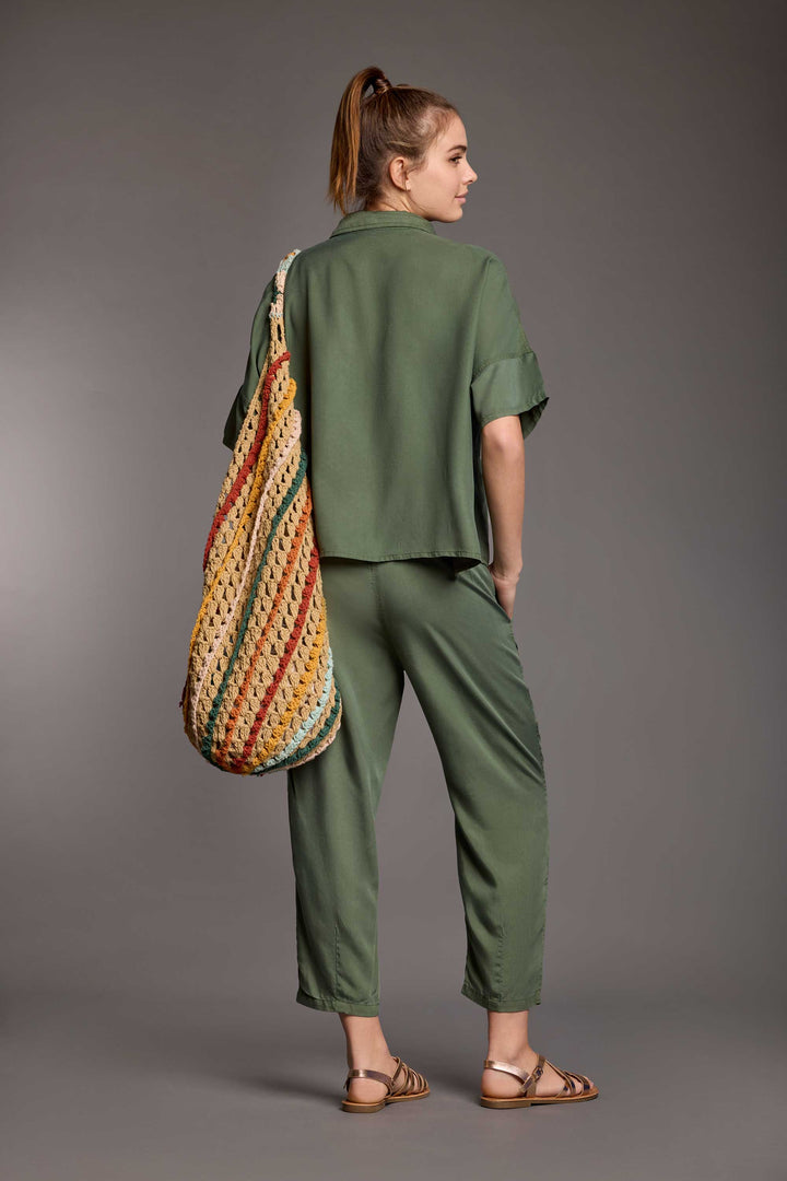 The Clara pants in tencel offer a comfortable fit and a relaxed, fluid design. The elastic waistband with drawstring and the side pockets make them perfect for a laid-back summer look.