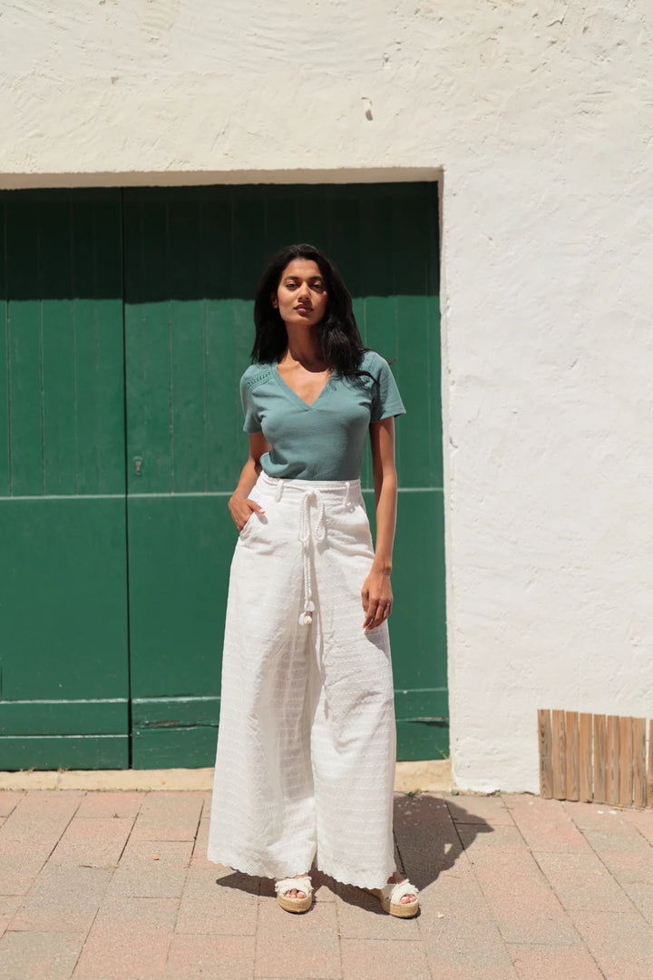 This V-neck T-shirt is perfect for a feminine and elegant look. The inlaid lace inserts add a touch of refinement to the shirt. The color is versatile and easy to match with other pieces in your wardrobe. Add style to your outfit with this T-shirt.