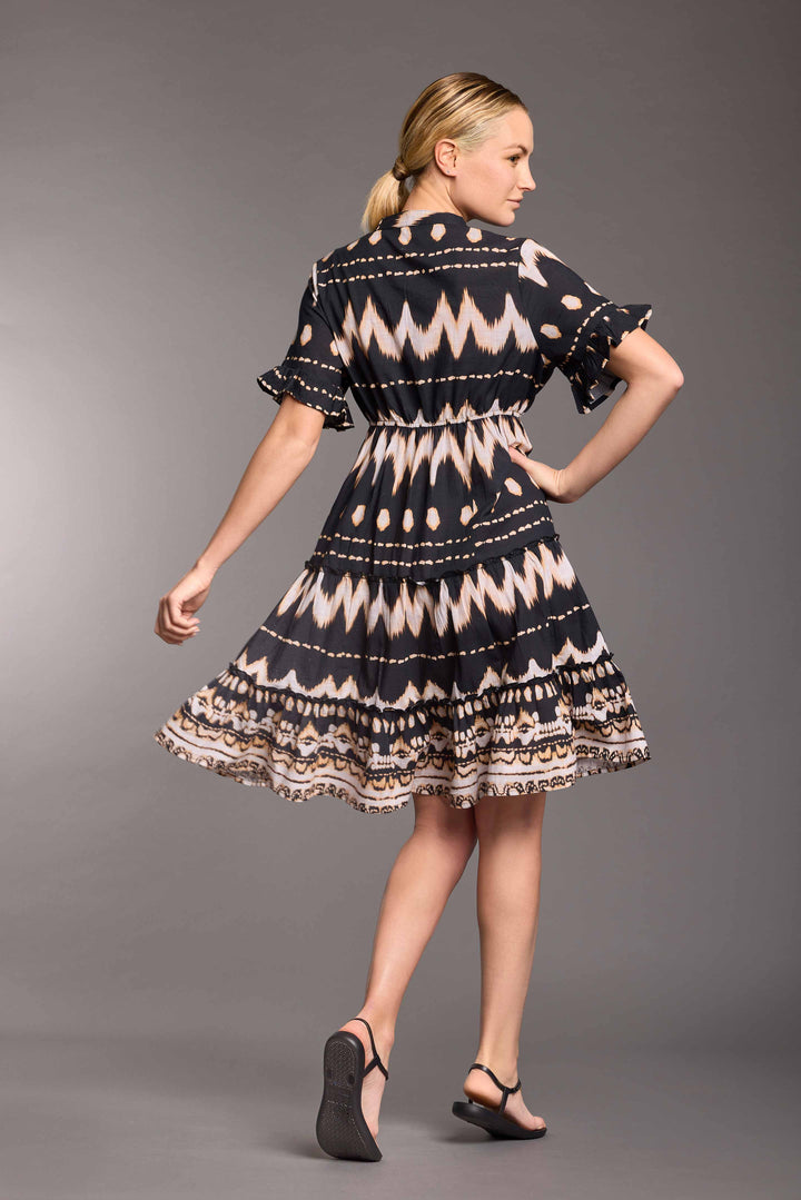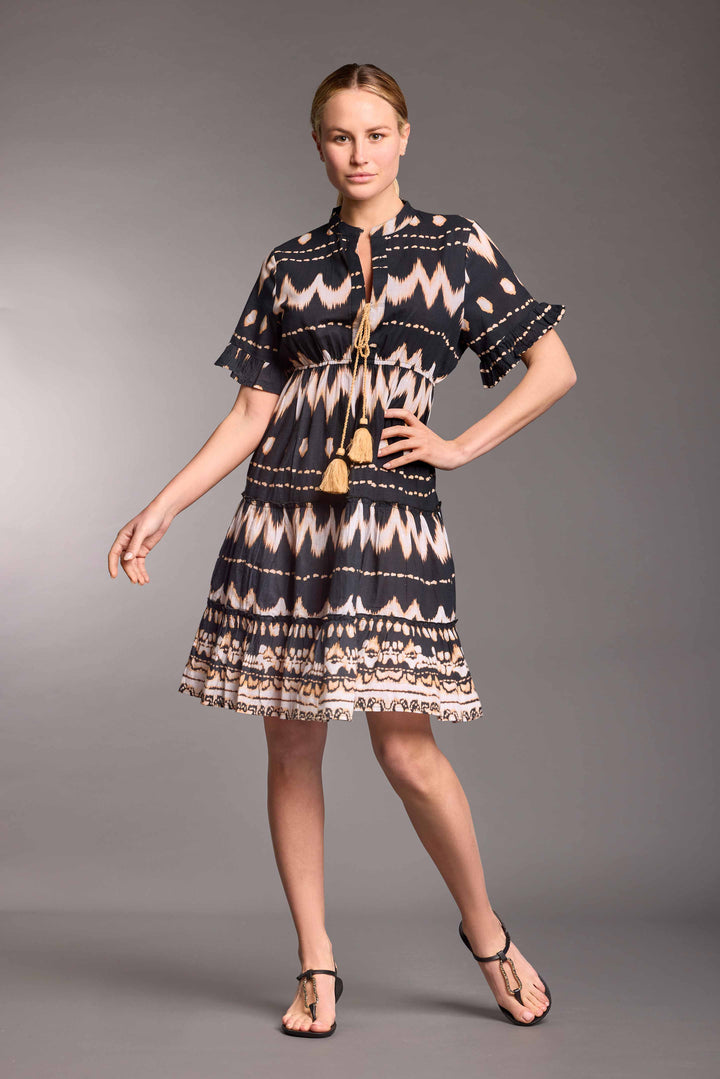 The Samira dress with ethnic print is perfect for a casual and refined look. The fresh and comfortable pure cotton will make you feel at ease during summer days, while the tie neckline with tassels and the skirt with ruffles add a chic touch.