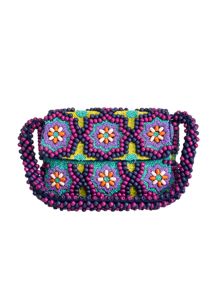 This handcrafted bag is embellished with beads in a delicate floral pattern. The internal pocket, along with the button closure, makes it ideal for keeping your belongings safe. The embroidered handle adds an elegant touch.