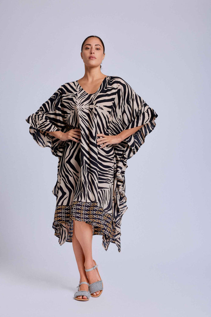 Long poncho in soft fabric with a charming zebra pattern. The batwing sleeves ensure an elegant and flowing silhouette, perfect for summer evenings by the sea or for a stylish aperitif. A versatile garment that easily matches your holiday outfits, turning any moment into an occasion of Mediterranean luxury.