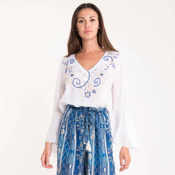 The Selene blouse with V-neck enhances the silhouette with sober elegance. The wide sleeves guarantee comfort and freedom of movement, perfect for warmer days. The ethnic pattern gives character and personality to the garment, making it ideal for those seeking a conscious and refined style. A versatile piece that easily adapts to multiple occasions, from casual to semi-formal.