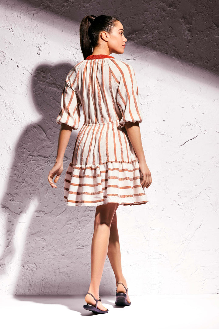 This Filicudi striped dress is perfect for summer thanks to its pure cotton fabric. The ¾ puff sleeves and hand-applied beads add a touch of elegance. With a deep V-neck and adjustable waist with drawstring and laces, it is comfortable and adaptable to every silhouette.