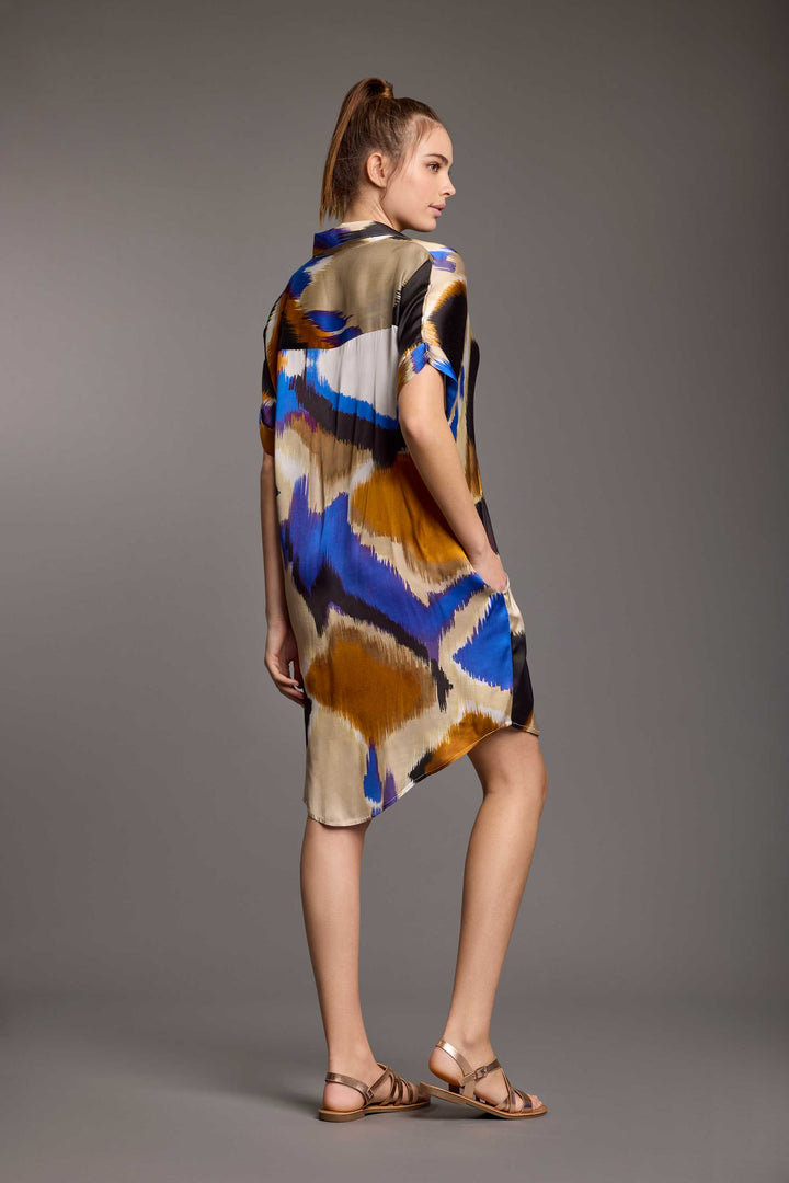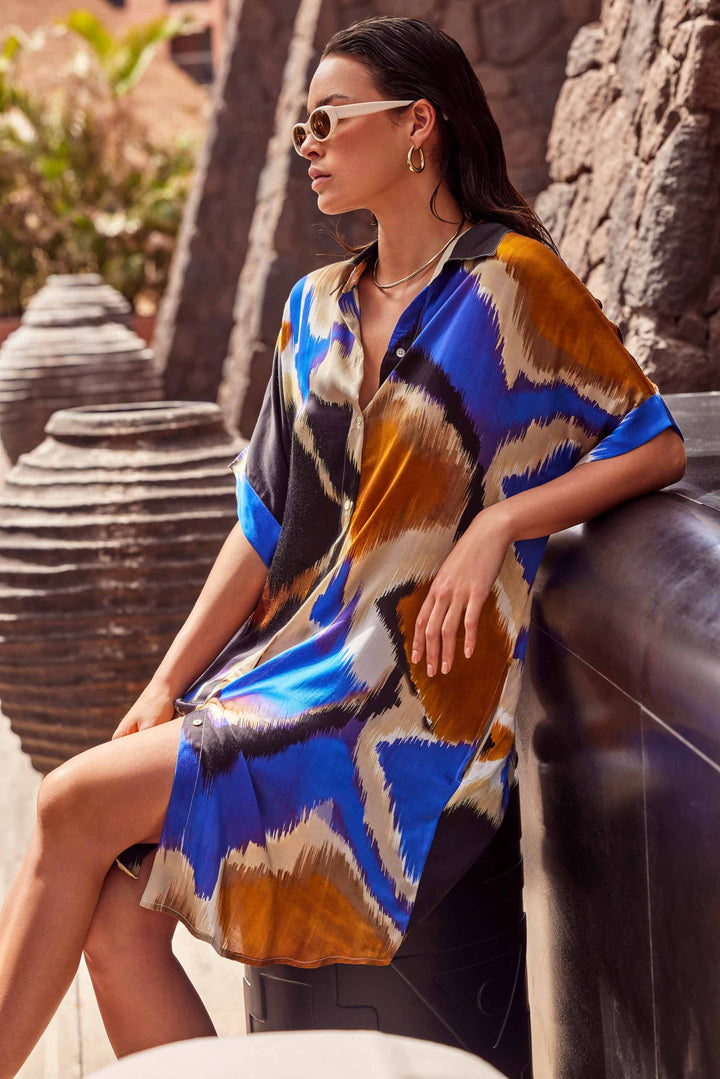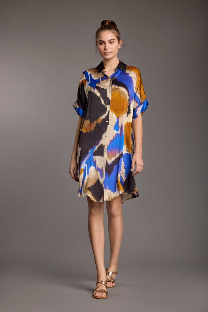 The Marzia modal multicolor shirt dress is the ideal choice for an elegant and fresh summer look. The collar and front buttons give it a sophisticated air, while the short sleeves and fluid cut make it perfect for warm days and special events. Thanks to the breathable fabric, this dress ensures maximum comfort.