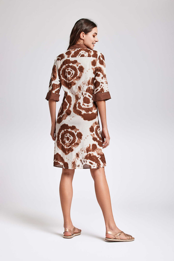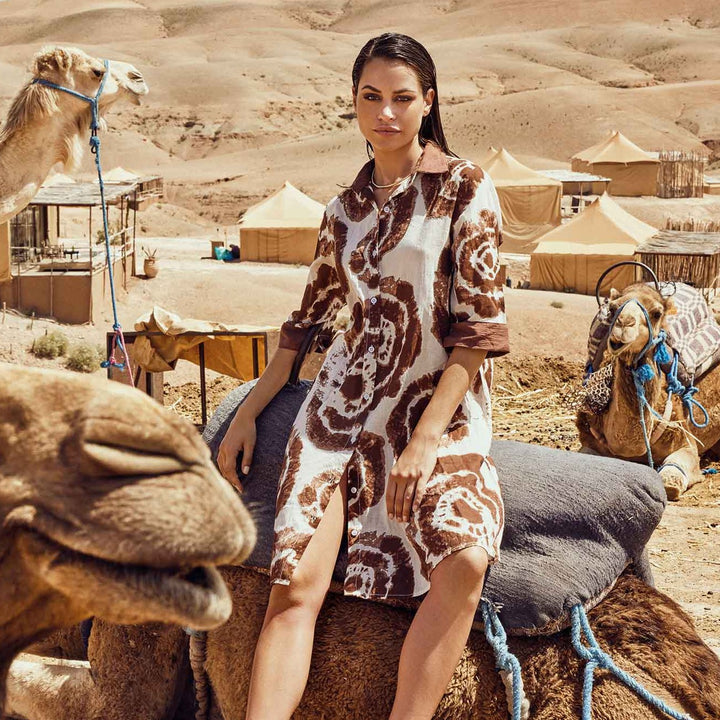 Our Sahara Shirt Dress is crafted from pure cotton for comfort and quality. L elegant Sahara pattern , 3/4 sleeves and classic shirt collar make it perfect for any occasion. Its A-line silhouette flatters the feminine silhouette. An exclusive addition to your wardrobe.