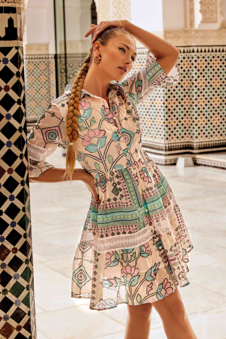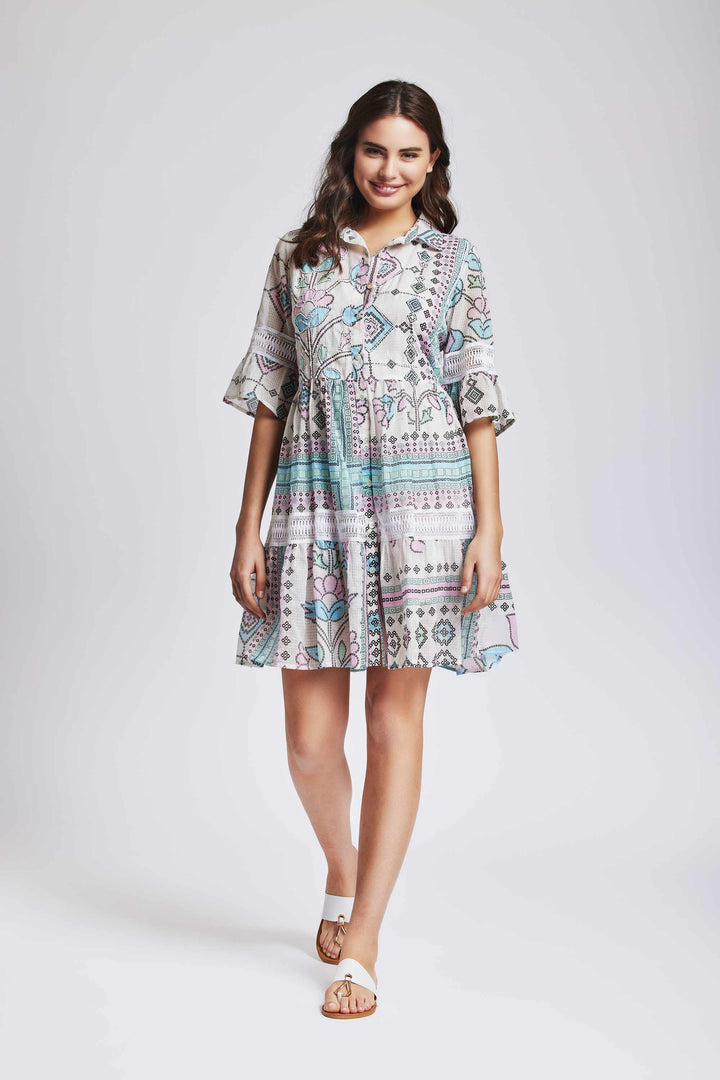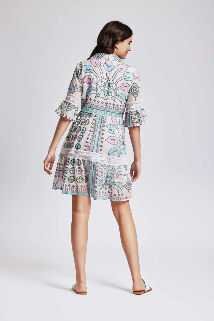 Show off your unique style with the Angie Dress in pure cotton. Featuring flared sleeves and a V-neck, this dress is decorated with hand-embroidered details for a touch of originality. The multi-patterned pattern will make you stand out from the crowd. Add a touch of pattern to your wardrobe.