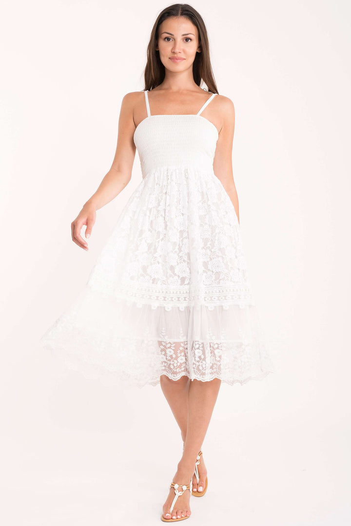 The Marghe lace dress combines comfort and elegance. The elasticized bodice fits the body perfectly, while the adjustable straps ensure a personalized fit. The delicate lace details add a touch of refinement, making this garment ideal for both casual and more formal occasions. A versatile choice for those seeking quality and style without compromise.