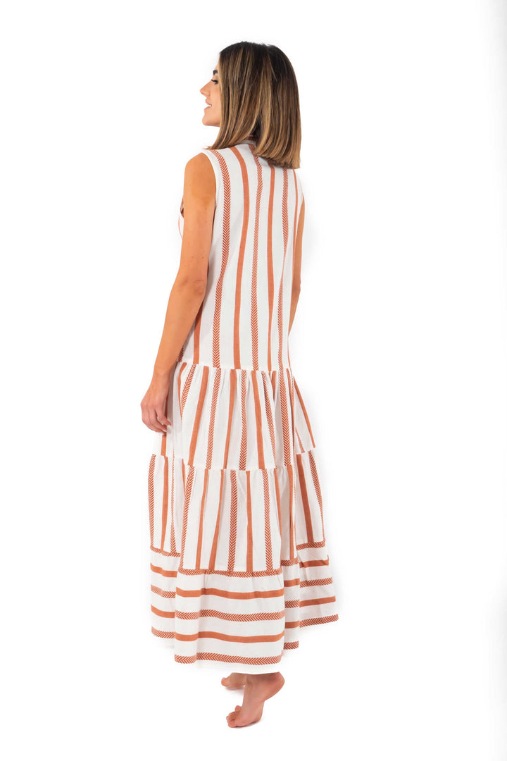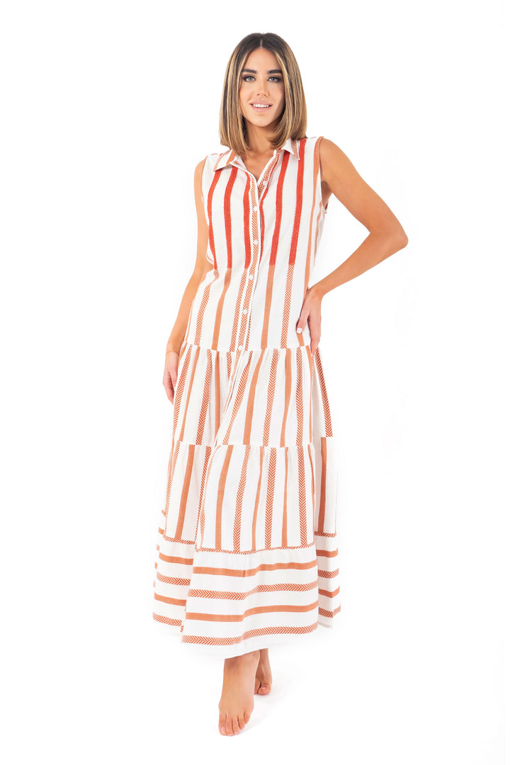 This elegant Striped Maxi Dress in pure cotton is perfect for summer. The long, sleeveless design offers comfort and freshness during hot days. The delicate yarn dyeing and hand-applied beads add a touch of elegance, while the collar and buttons at the front complete the style. The full ruffled skirt and A-line line create a romantic and feminine look.