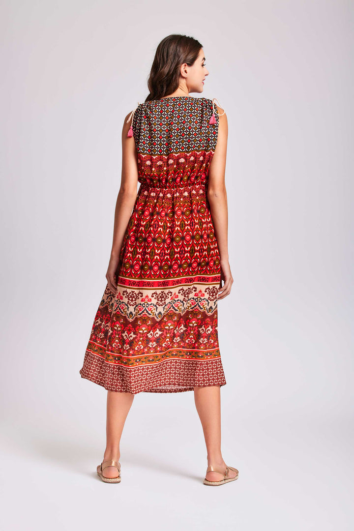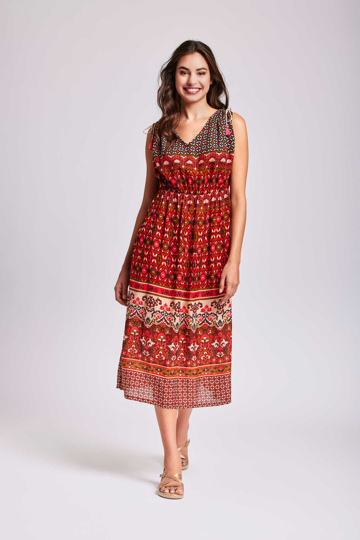 This long dress features a sleeveless design with tasseled sleeves, perfect for the summer season. The waist waist and V-neckline enhance the figure, while the warm-toned pattern adds a touch of color and style. Ideal for an elegant and refined look.