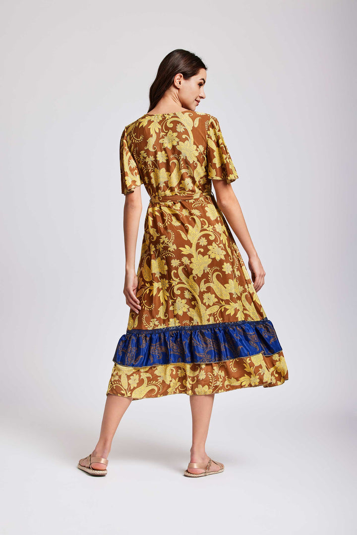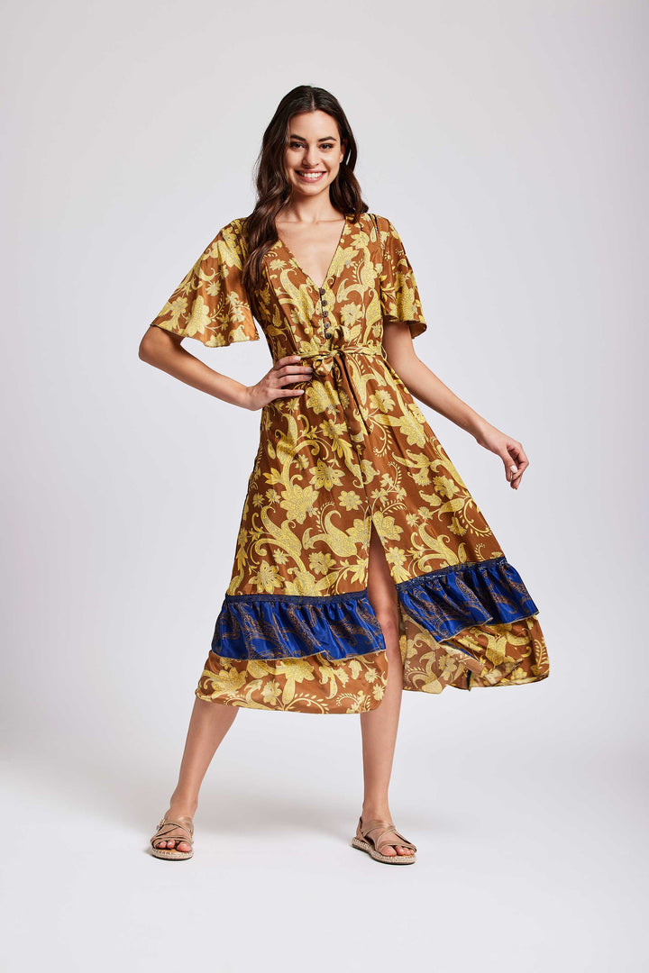This elegant Jacquard pattern Long Dress will make you feel confident and fashionable. The long design and short, wide sleeves create an elongated and slender silhouette. The deep V-neck is a feminine touch, while the jacquard print adds a touch of originality. With buttons on the front, a ruffled skirt and an included belt, this dress is perfect for any occasion.