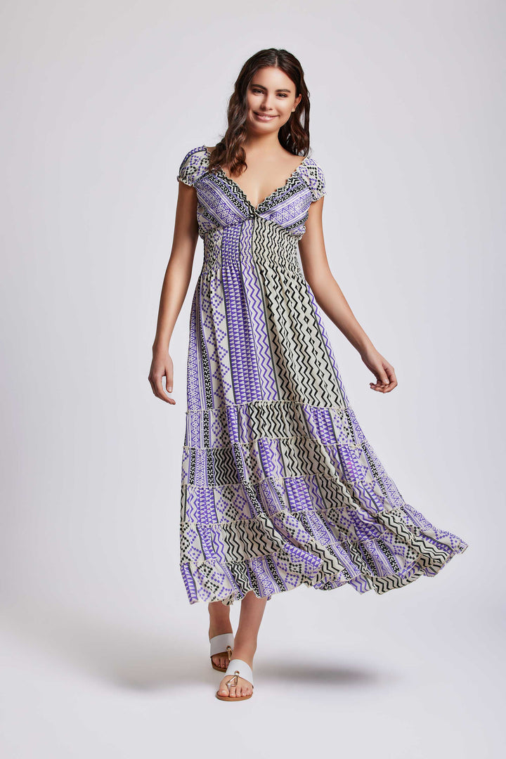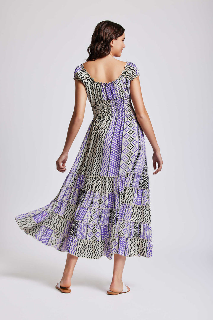 Dress in style with the geometric pattern maxi dress. Thanks to the gathered bodice and puffed sleeves, you will have an elegant and sophisticated look. The long model and the ruffled skirt will make you appear slender and feminine. Perfect for special occasions or nights out.