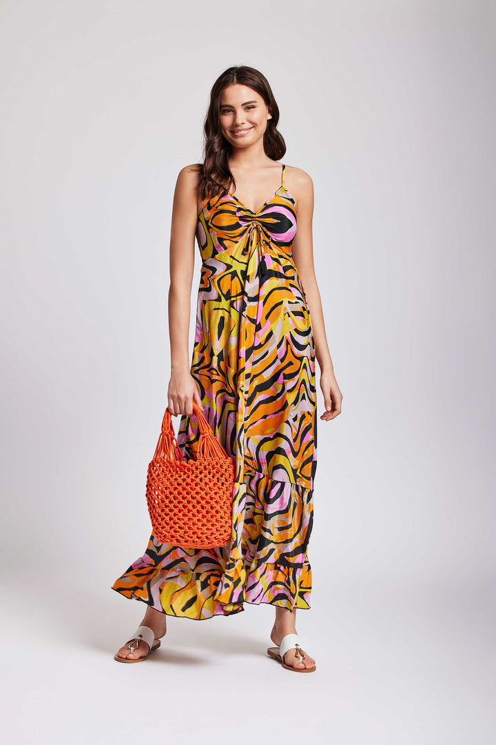 This maxi dress features a colorful zebra pattern , perfect for summer occasions. The spaghetti straps and V-neckline add an elegant touch, while the adjustable drawstring and long ruffle skirt offer comfort and versatility. With a fitted bodice that flatters the feminine figure, it is a must-have for every woman's wardrobe.
