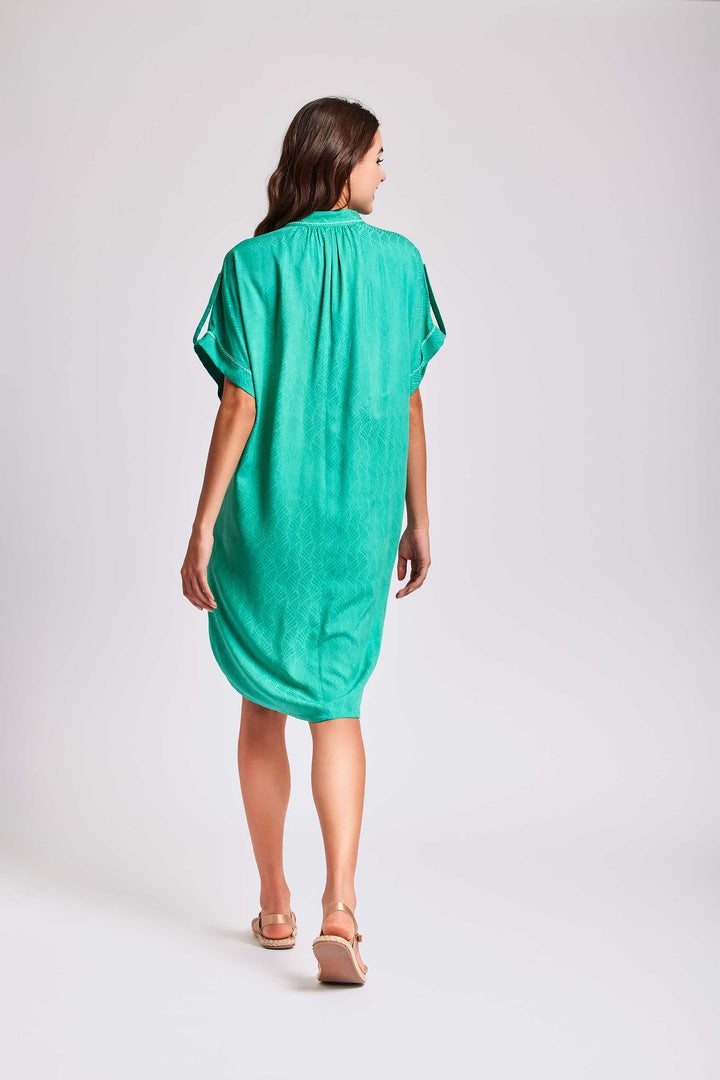 Made from a comfortable, lightweight fabric, the emerald dress features short, wide sleeves, with an elegant mandarin collar and V-neck. Buttons on the sleeves allow for a customizable fit. A versatile and chic garment for any occasion.