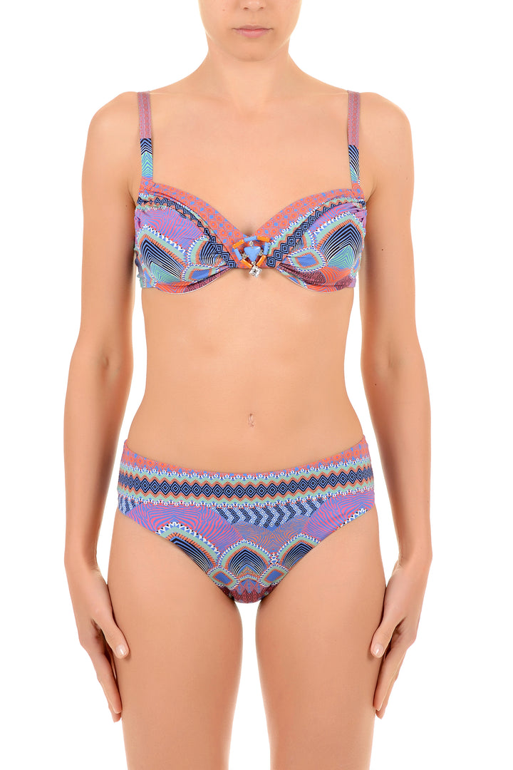 This bikini combines elegance and practicality thanks to the classic slip paired with a top embellished with a refined jewel. The adjustable straps ensure a personalized fit, while the selected pattern gives a distinctive touch, ideal for those seeking style and comfort on every occasion.