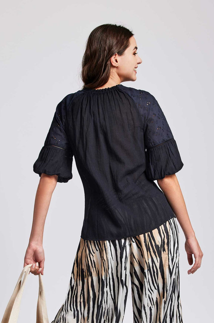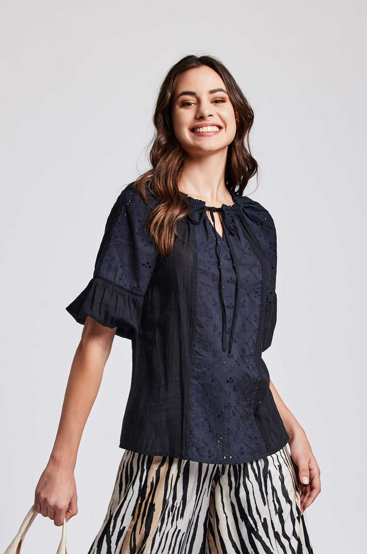 Wrap yourself in elegance with our Petra Lace Embroidered Blouse. Made of pure cotton, this blouse offers maximum comfort and breathability. The short sleeves with ruffles and the adjustable neckline with tie add a touch of femininity, while the lace details give a touch of refinement to your outfit.