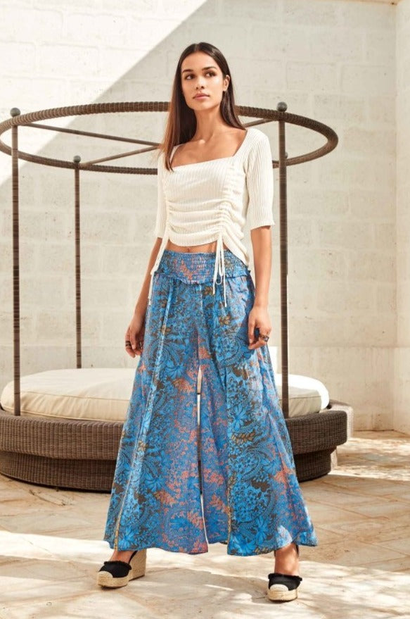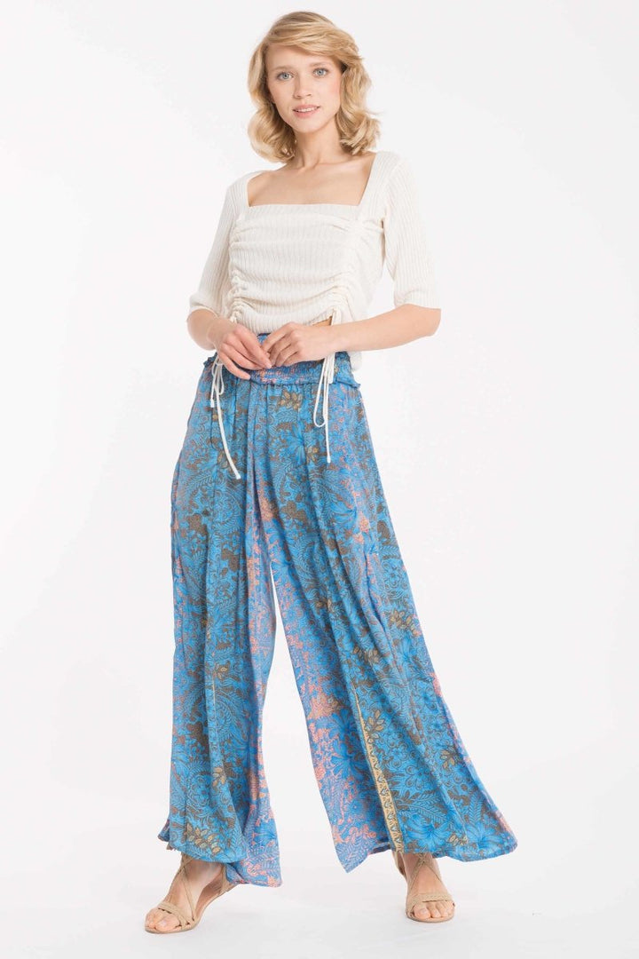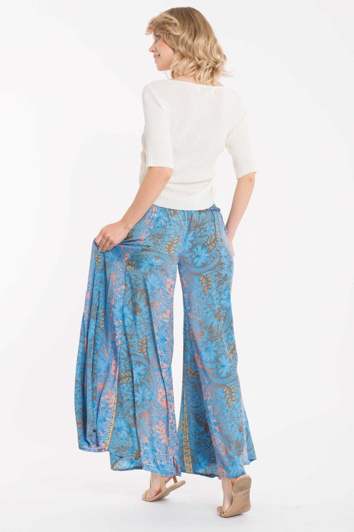 Palazzo pants in fine pattern jacquard in shades of turquoise. Characterized by a wide and fluid cut, they offer comfort without sacrificing refined elegance, perfect for completing sophisticated and contemporary outfits.