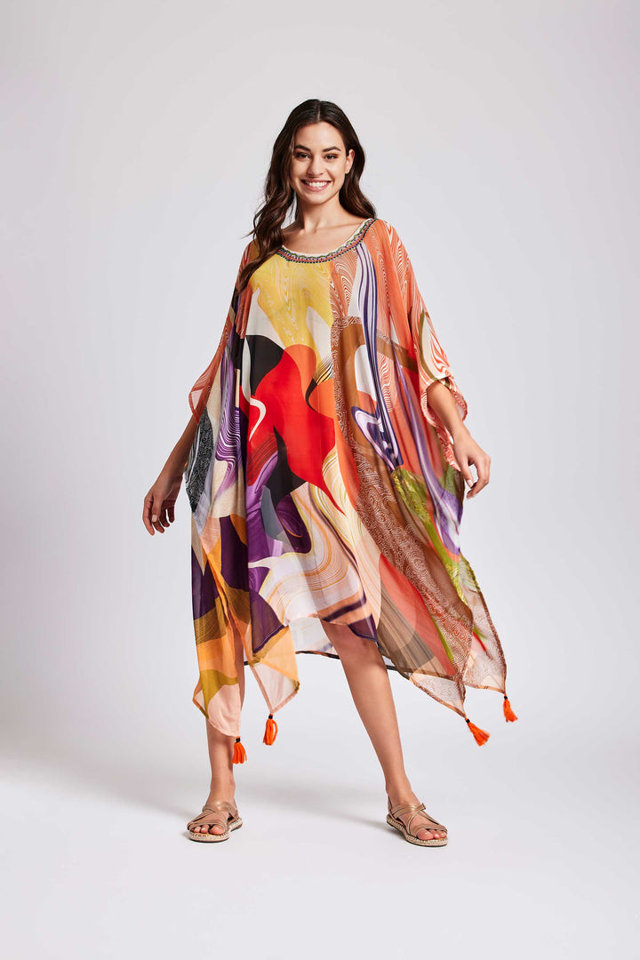 Made with hand-applied lace on the round neckline, the Tango Long Poncho is an elegant and refined accessory. With batwing sleeves and side slits, it gives a touch of style to any outfit. Add a touch of femininity with tassels at the end.