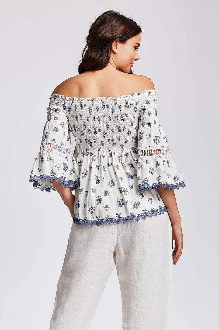 Refined top with 3/4 bell sleeves and gathered A-line bodice. The handcrafted embroidery motifs enhance the elegance of the top, while the bateau collar and inlaid lace add a touch of exclusivity. Ideal for a sophisticated and classy look.