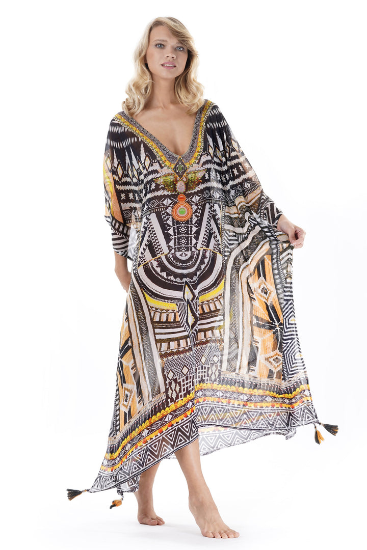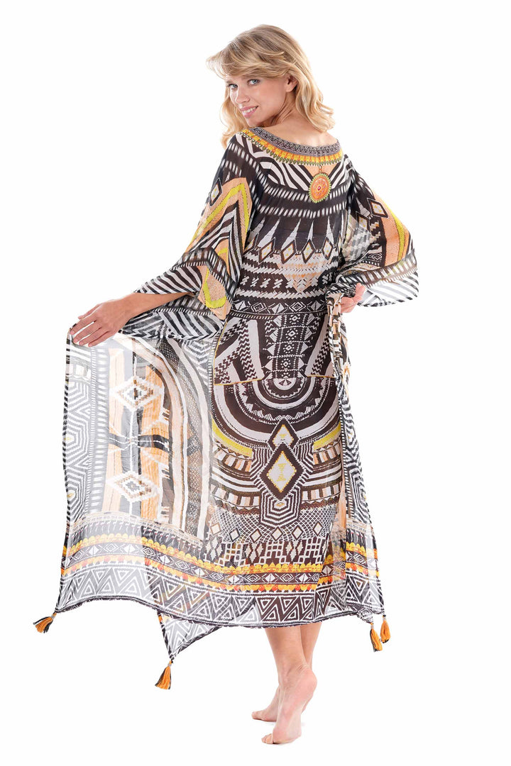 This elegant long poncho features delicate tassels along the hem and side slits for greater movement and comfort. The V-neckline enhances the silhouette, making it a versatile piece that combines style and ease of wear.