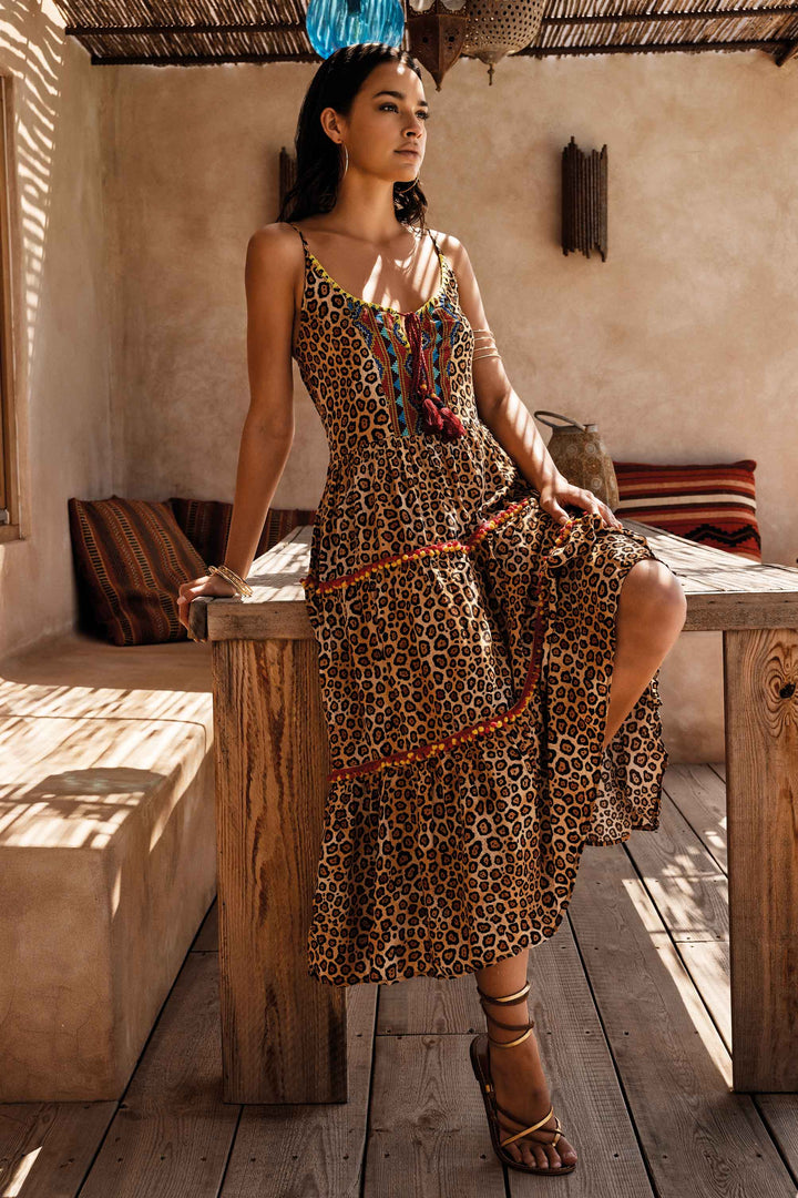 Show off your boldness with the Carrie Leopard Print Straps Dress . Featuring a longline design and an adjustable tie-neckline with tassels, bring your passion to the forefront. The ruffled skirt and straps add a touch of style, while the leopard pattern brings a wild energy to your outfit. Combine fashion with adventure!