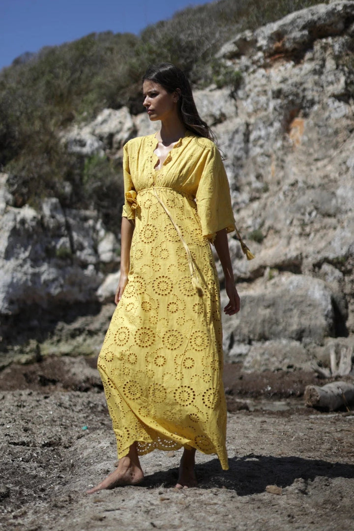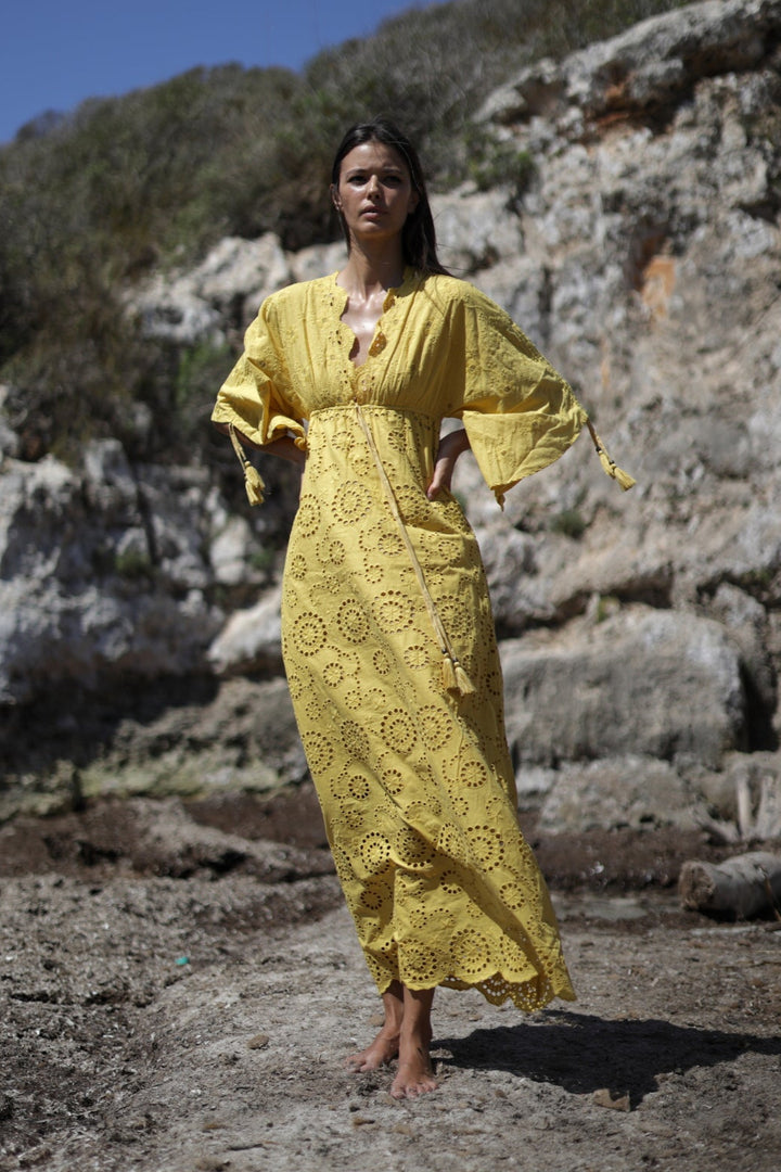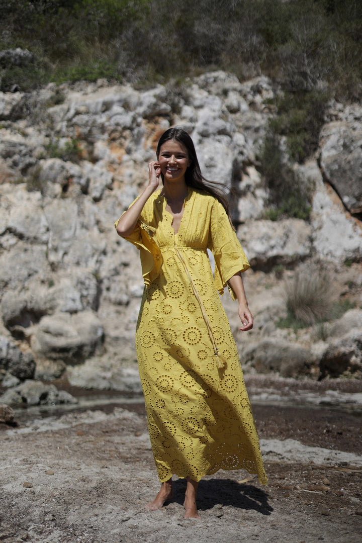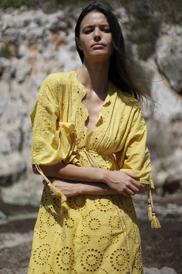 This yellow dress stands out for its openwork embroidery that gives elegance and freshness. It highlights the craftsmanship that characterizes this garment. The flattering neckline enhances your silhouette, while the tie ribbons and the flowing skirt add movement and lightness. The slightly wide sleeves are finished with ribbon details and handcrafted pompons.