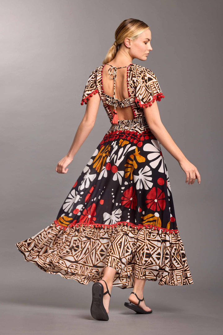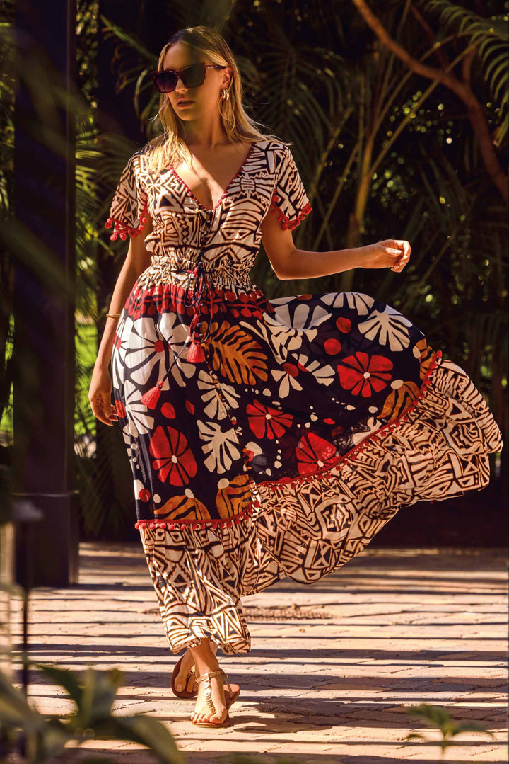 The splendid long dress Iole, in multicolored viscose, offers a light and fluid design that perfectly adapts to every summer event. The drawstring at the waist and the chic and comfortable style make it perfect for casual occasions and more elegant evenings. With its long and maxi model, it is the ideal piece for a refined and fashionable look.