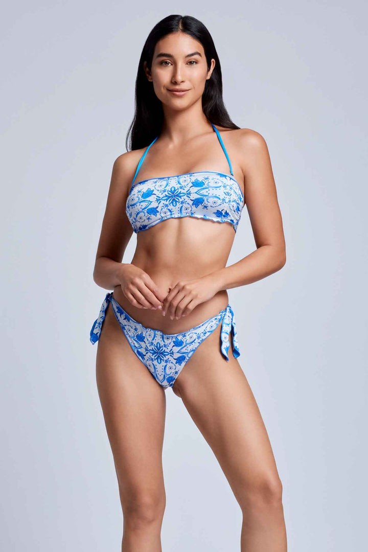 Add a touch of fashion to your summer wardrobe with this blue Capri bandeau bikini! The removable straps and cups offer maximum comfort and support, while the tie-front bottom adds a touch of femininity. Bring the beauty and color of the island of Capri to the beach with you!