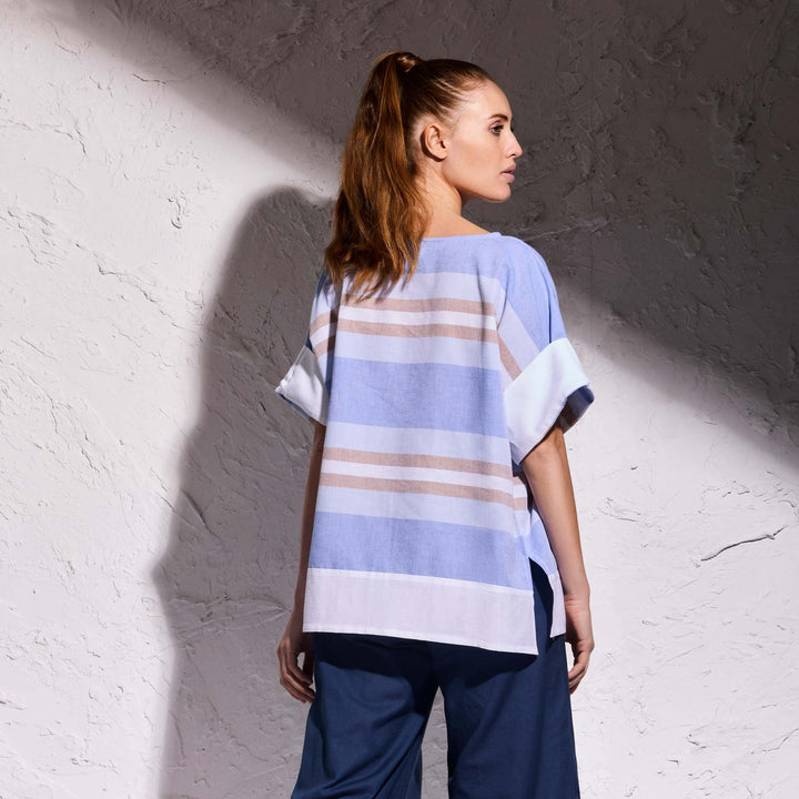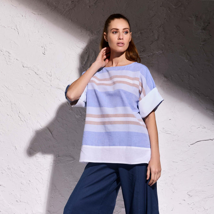 Take a spin with your pattern with the pure cotton and linen striped blouse. The rolled-up half sleeves and comfortable fit make this blouse a must-have for your summer wardrobe. Soft seams and pattern stripes complete this trendy look.