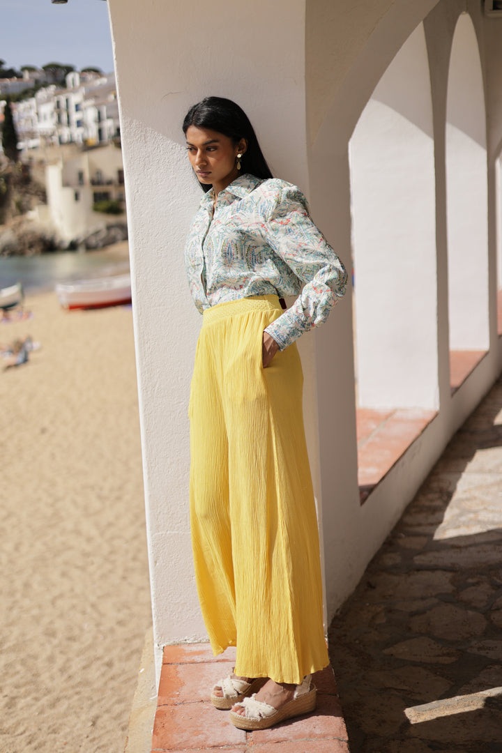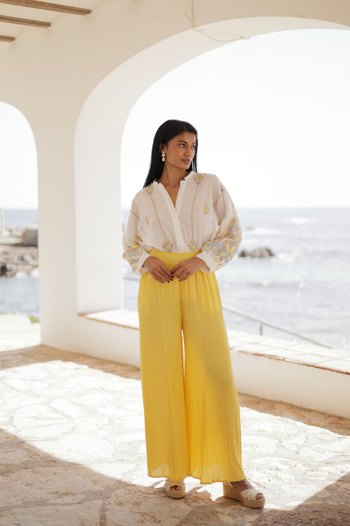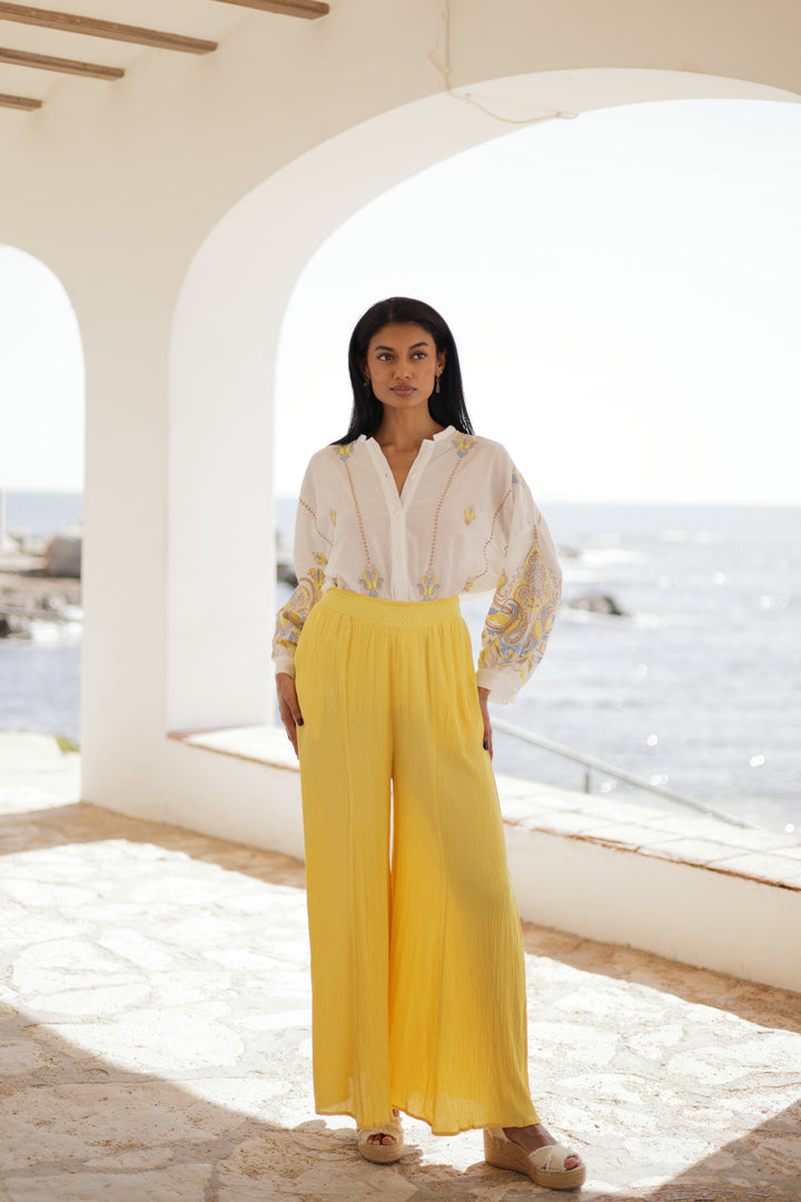Palazzo pants are the ideal choice for those seeking comfort and elegant style. Thanks to the palazzo model and the lightness of the fabric, you can move with ease. The yellow color brings brightness to your outfit, while the lace insert at waist adds a touch of femininity.