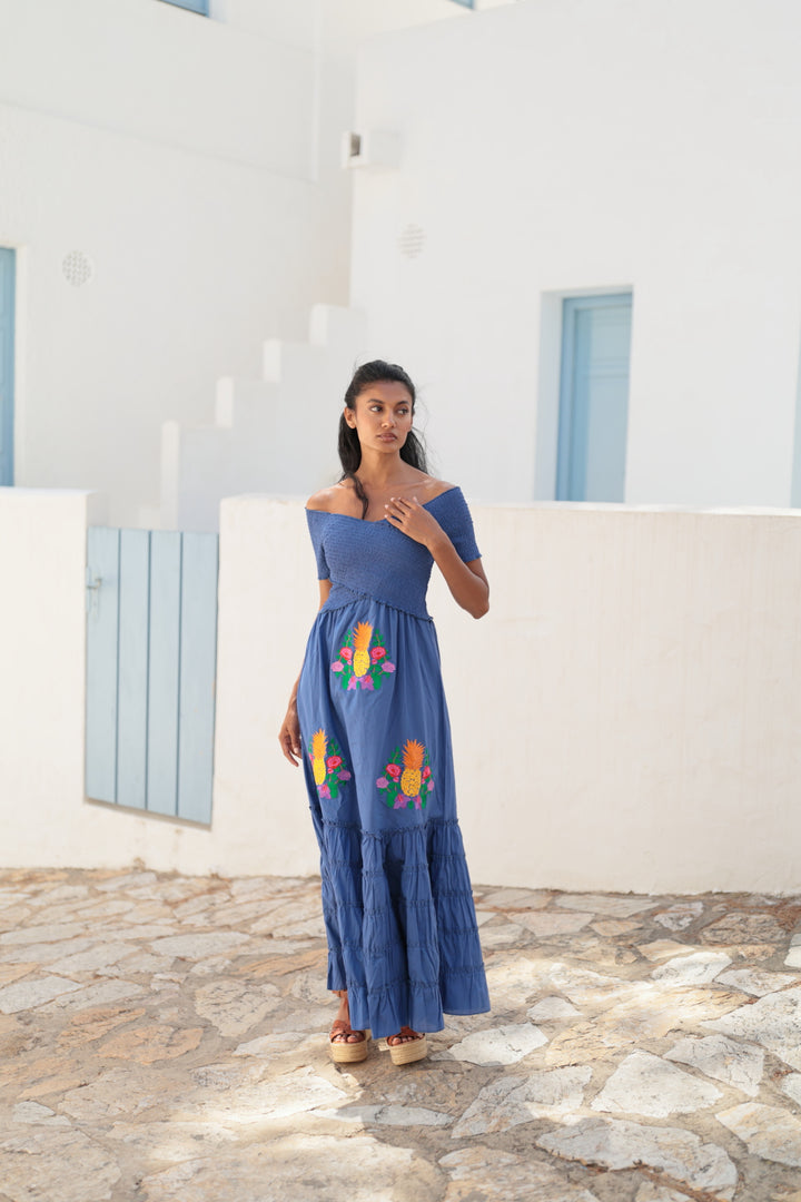 Dress in an elegant blue. The perfect combination of freshness and style. It stands out for the contrasting embroidery, which gives it a boho and original touch. The top features a crossed silhouette with ruching that enhances the figure with a flattering fit, while the short ruched sleeves add a delicate and feminine touch. The long, flowing skirt with ruffles offers movement and comfort. The handmade embroidery stands out on the skirt.