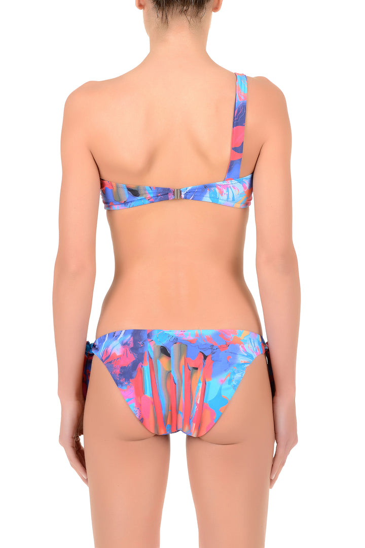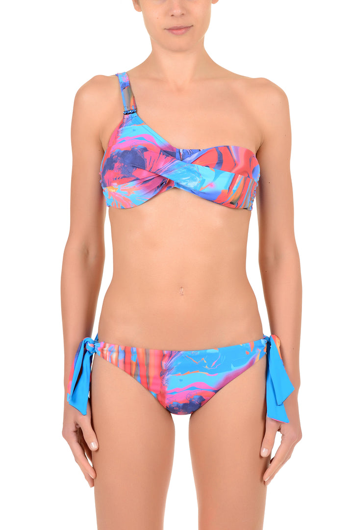 Bikini with a modern and feminine style, composed of a one-shoulder bandeau top that enhances the silhouette with an elegant and asymmetrical touch. The lively pattern gives a summery and captivating look, perfect to stand out under the sun. The bottom is adjustable thanks to practical side ties, designed to ensure comfort and adaptability to every body type. A perfect mix of style and functionality, ideal for standing out on the beach or by the pool.