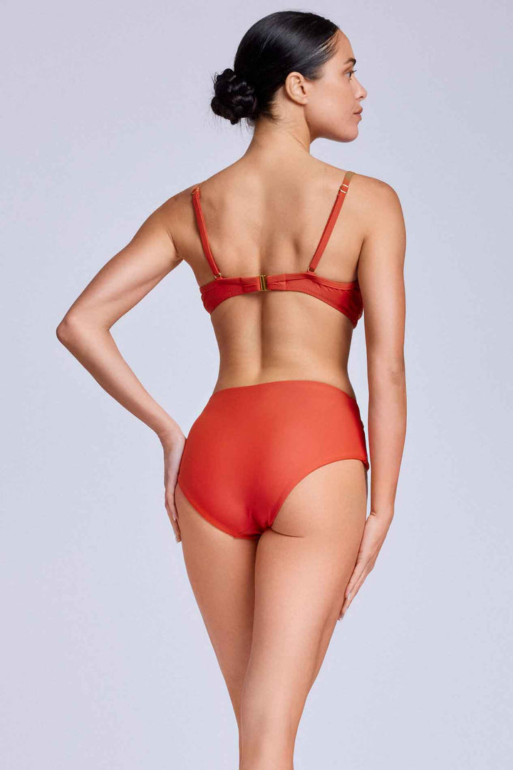 This high-waist bikini with preformed cups offers a flattering silhouette combined with an elegant design. The bottom is enhanced by a refined jewel detail that adds a touch of sophistication, while the adjustable straps ensure a perfect and comfortable fit. Ideal for those seeking style with refined comfort.