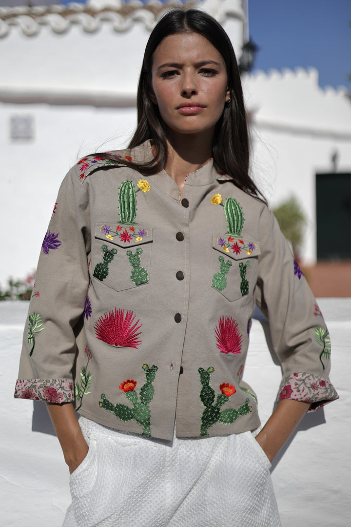 Jacket with handcrafted embroidery. Bohemian-inspired. It stands out for the contrasting embroidery on the front, back, and sleeves. With a Tunisian collar. Long sleeves. Front closure with aged metal buttons and pockets. Its embroidery and floral patterns are the true protagonists of this garment, highlighting the delicate and artisanal craftsmanship that makes it so special. Made of lightweight cotton. With floral lining. It is recommended to take one size larger than usual. The cactus jacket will become the perfect accessory to give your look a bohemian and sophisticated air!