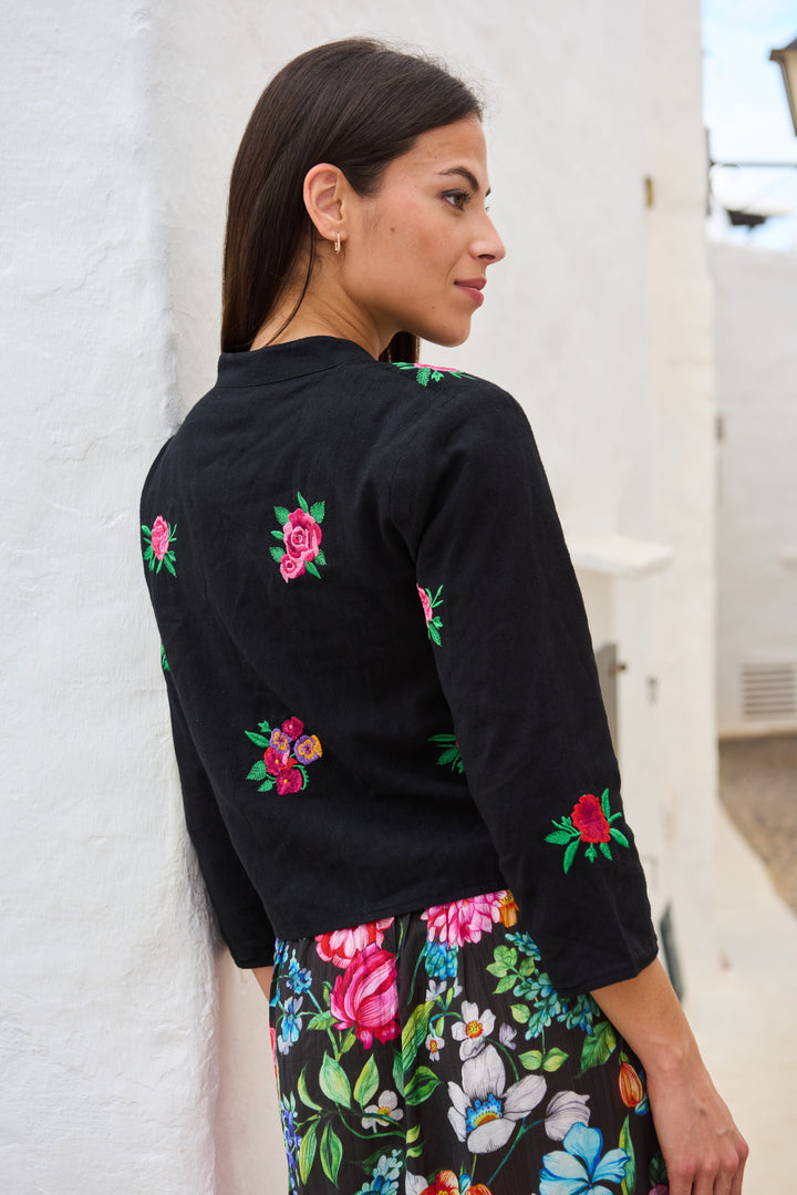 Jacket made of lightweight cotton, black color. Perfect for those looking for a statement piece. It stands out for its contrasting embroidery, crafted with an artisanal touch that enhances its unique style. This embroidery gives it a bohemian and sophisticated vibe. Features a front closure with metal buttons, 3/4 sleeves, and a Tunisian collar. It is recommended to take one size larger than usual. Ideal for completing casual or more elegant looks, but always with great personality!