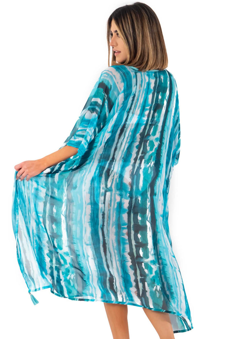 Long poncho in wave pattern with deep V-neck and batwing sleeves that ensure freedom of movement. The side slits add elegance and fluidity, while the tassels at the ends give a sophisticated bohemian touch. Perfect for summer evenings by the sea or for a refined holiday look.