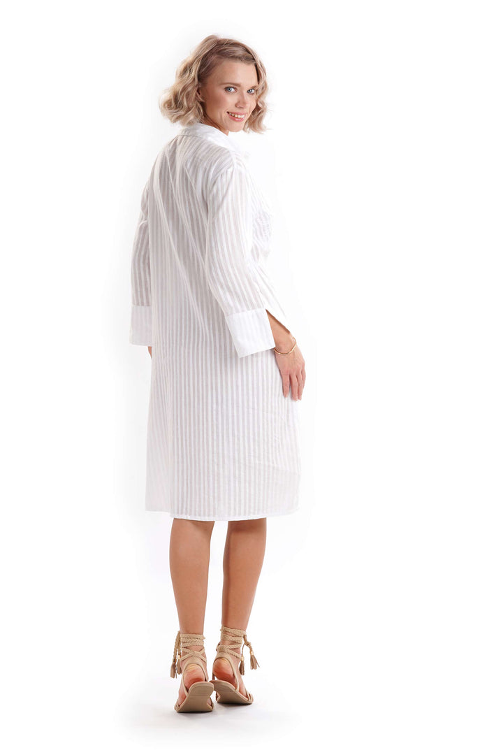 This pure cotton shirt dress is perfect for those seeking uncompromising elegance. The garment stands out for the delicate embroidery on the bust that adds refinement and movement, while the side slits ensure freedom of movement and a modern silhouette. The choice of pure cotton guarantees breathability and comfort throughout the day, maintaining an impeccable structure.