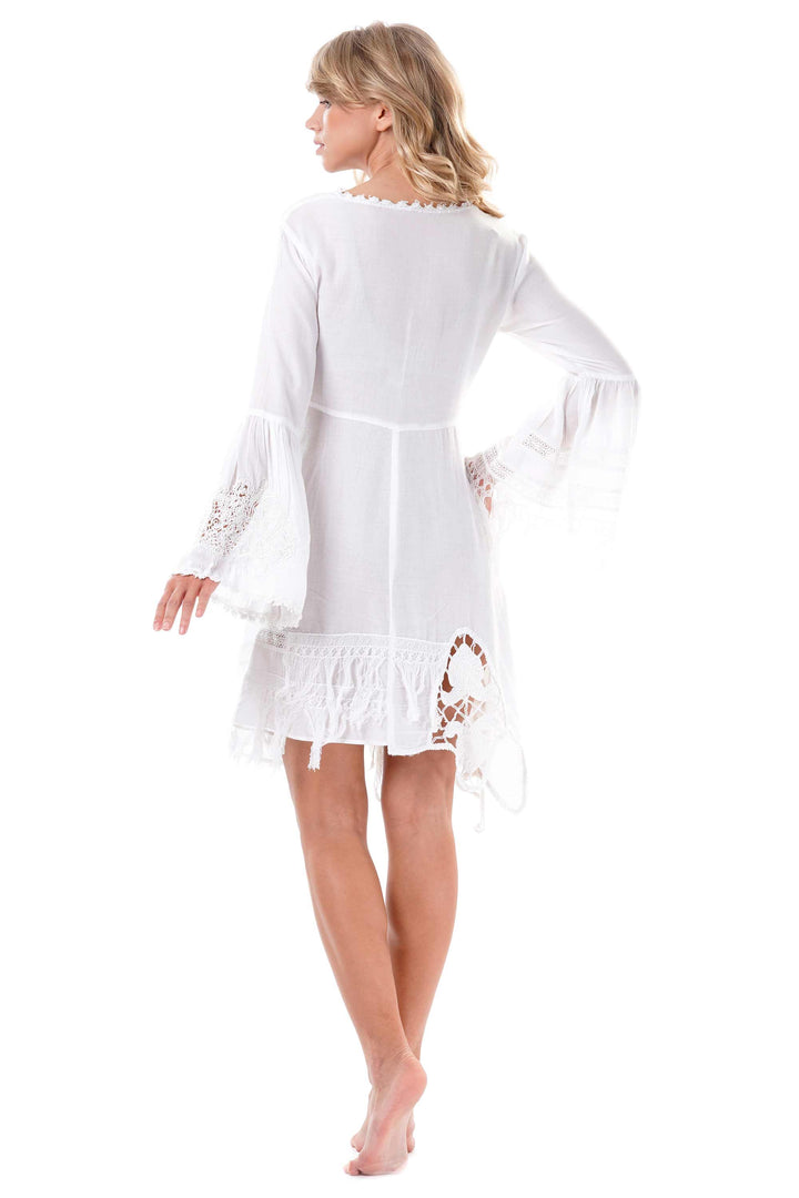 This dress is distinguished by its elegant V-neckline and fringes that add movement and character to the garment. The macramé lace details highlight the artisanal craftsmanship, offering a refined and sophisticated touch. Made of pure cotton, it guarantees comfort and breathability, ideal for those seeking style and practicality in a single dress.