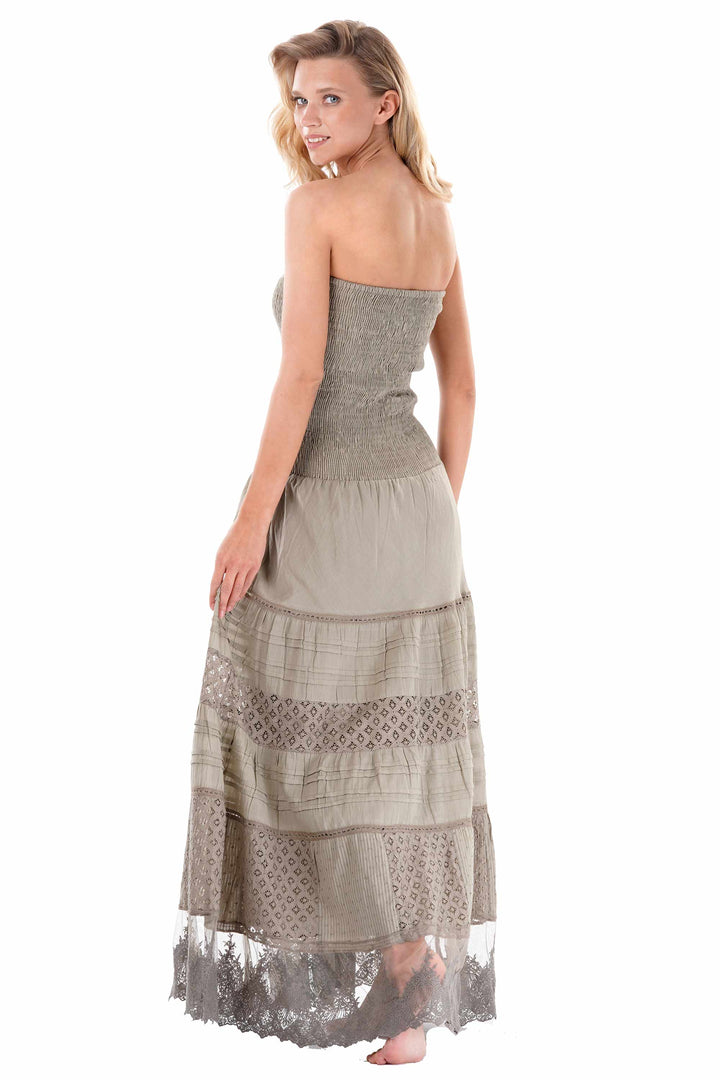 This elegant long dress in pure cotton with lace details features an elastic bust that ensures a flawless fit. The bandeau design enhances the silhouette with a sophisticated and feminine cut. This garment represents the ideal choice for those seeking comfort and style, perfect for special occasions or refined everyday elegance.
