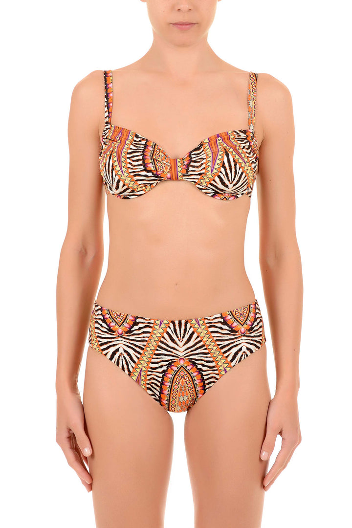 This bikini with cups available in C, D, and E guarantees adequate support and a perfect fit for different needs. The adjustable straps allow for personalized comfort, while the classic slip ensures an elegant and uncompromising silhouette. The ethnic pattern gives a distinctive and sophisticated touch, ideal for those who want an original and high-quality look at the beach.