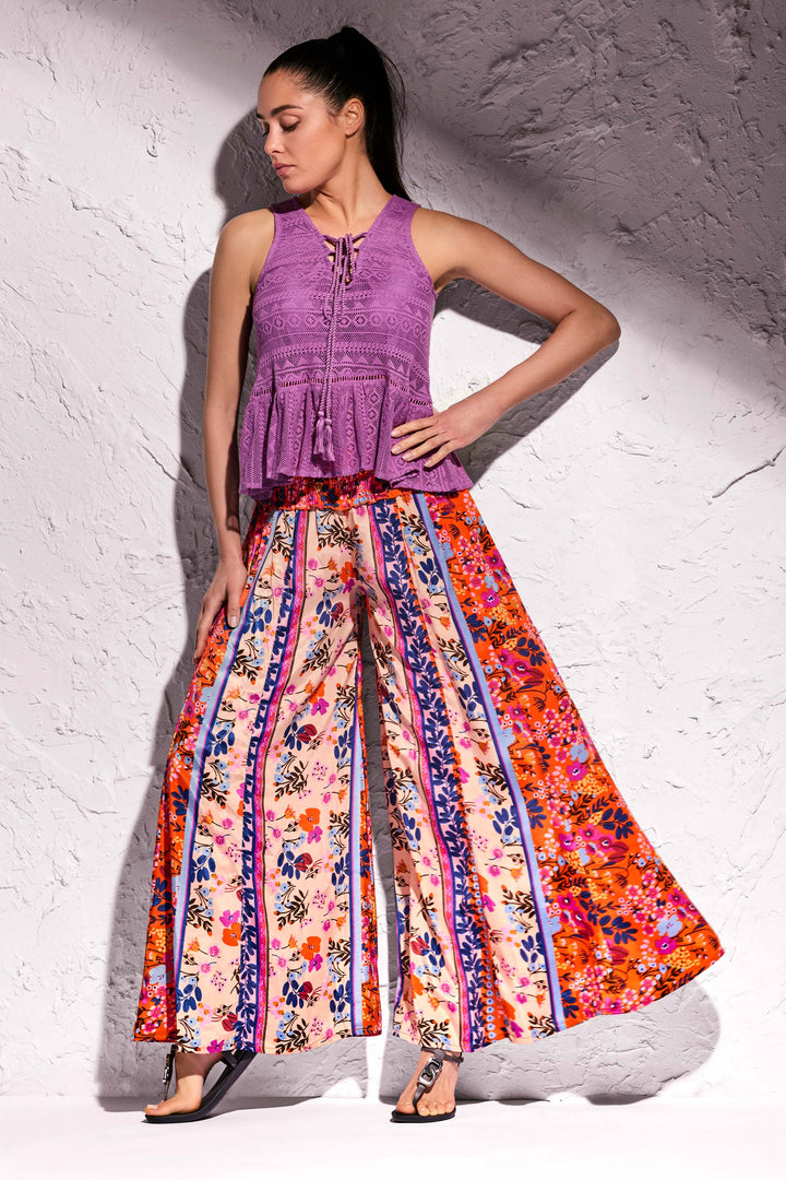 Palazzo pants with waist waist and floral pattern . Elegant and versatile model to always be in step with fashion. Add a touch of spring to your wardrobe with these light and comfortable pants.
