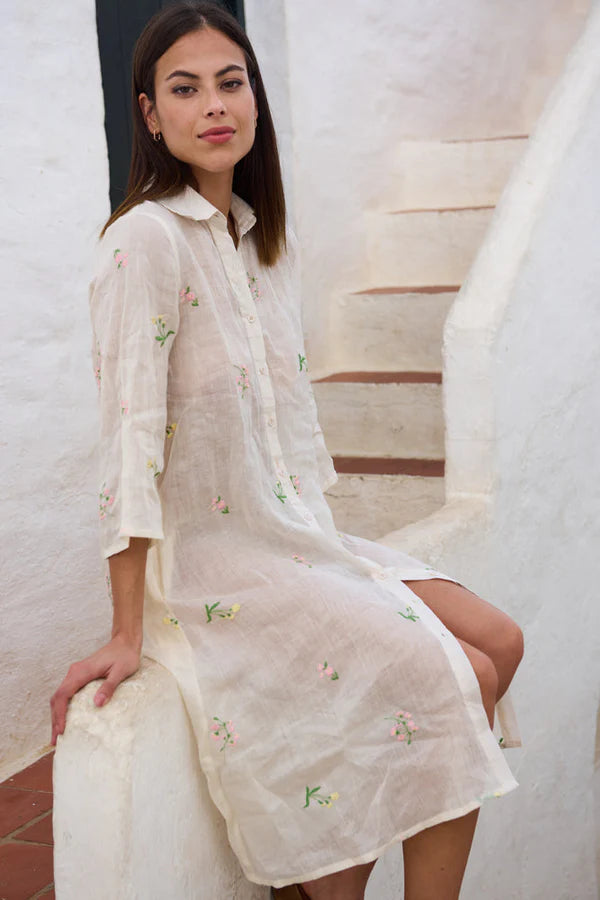 Lhe dress made of sustainable plant-based fabric is a high-quality, sustainable piece with an elegant design. The fine fabric and colorful flower embroidery make it unique. Perfect for a fresh, spring look. Available in white, with a front button closure for an extra touch of style.